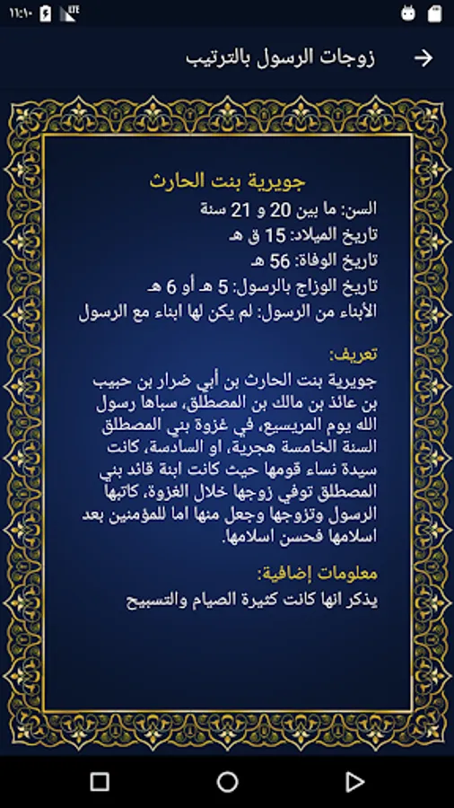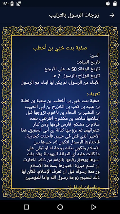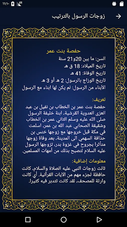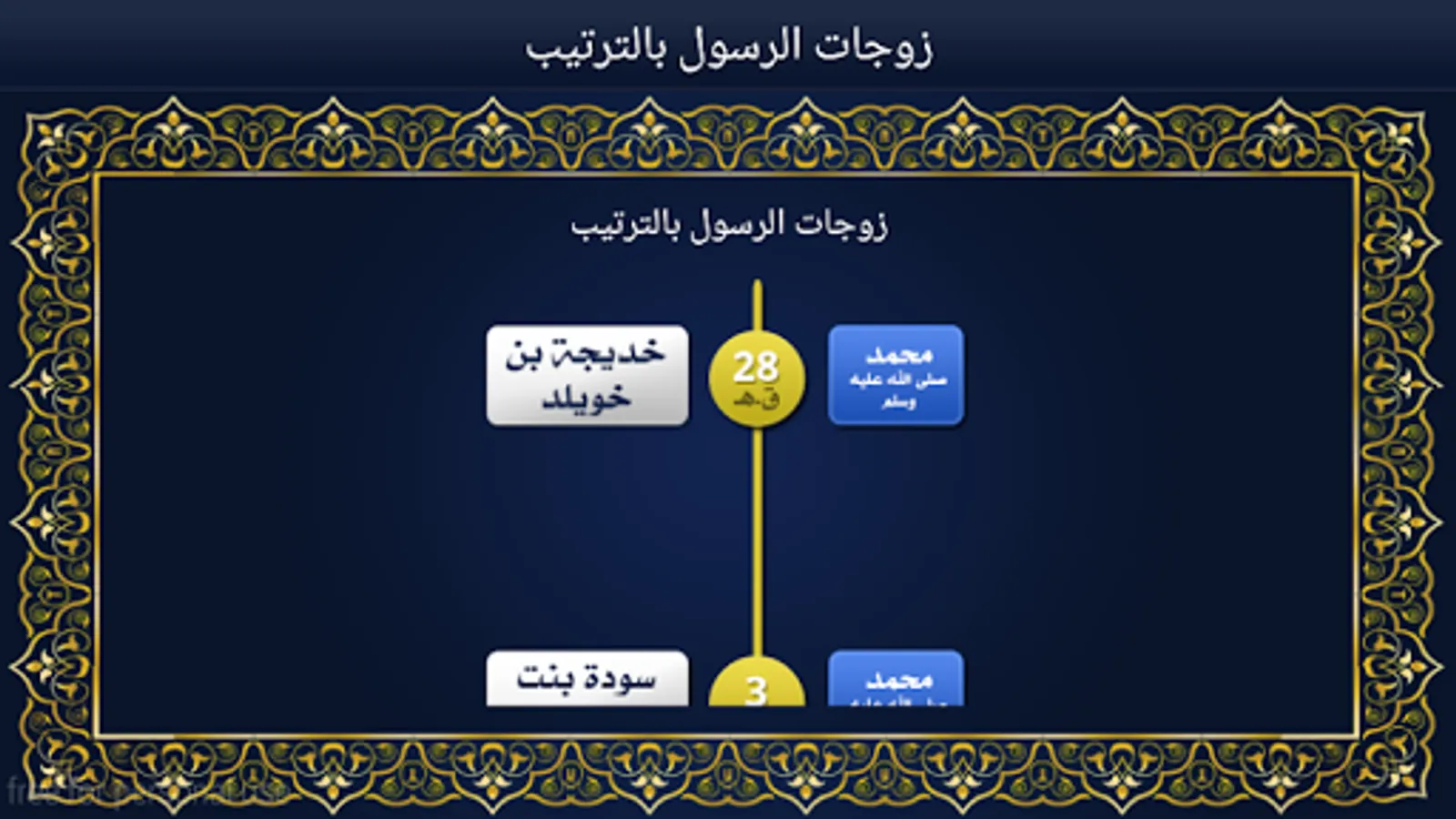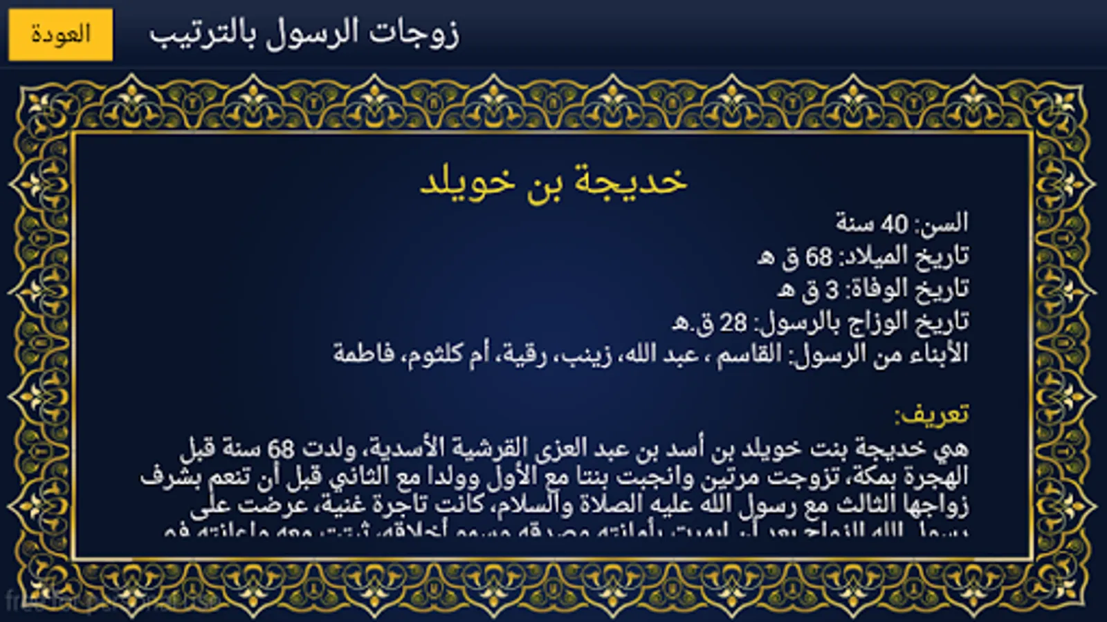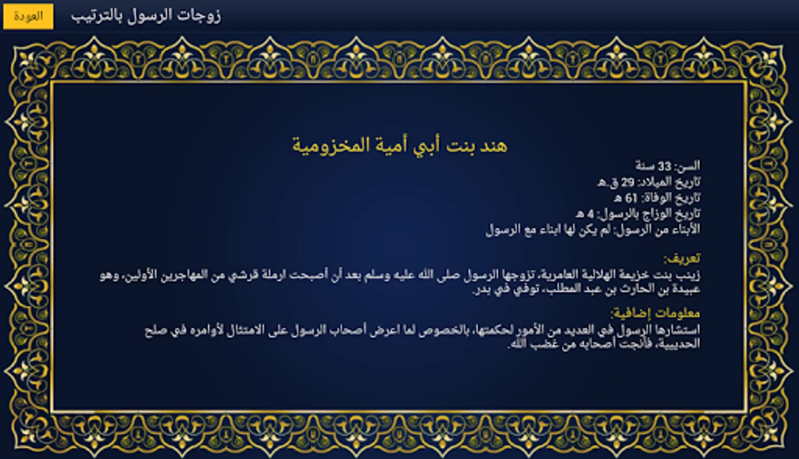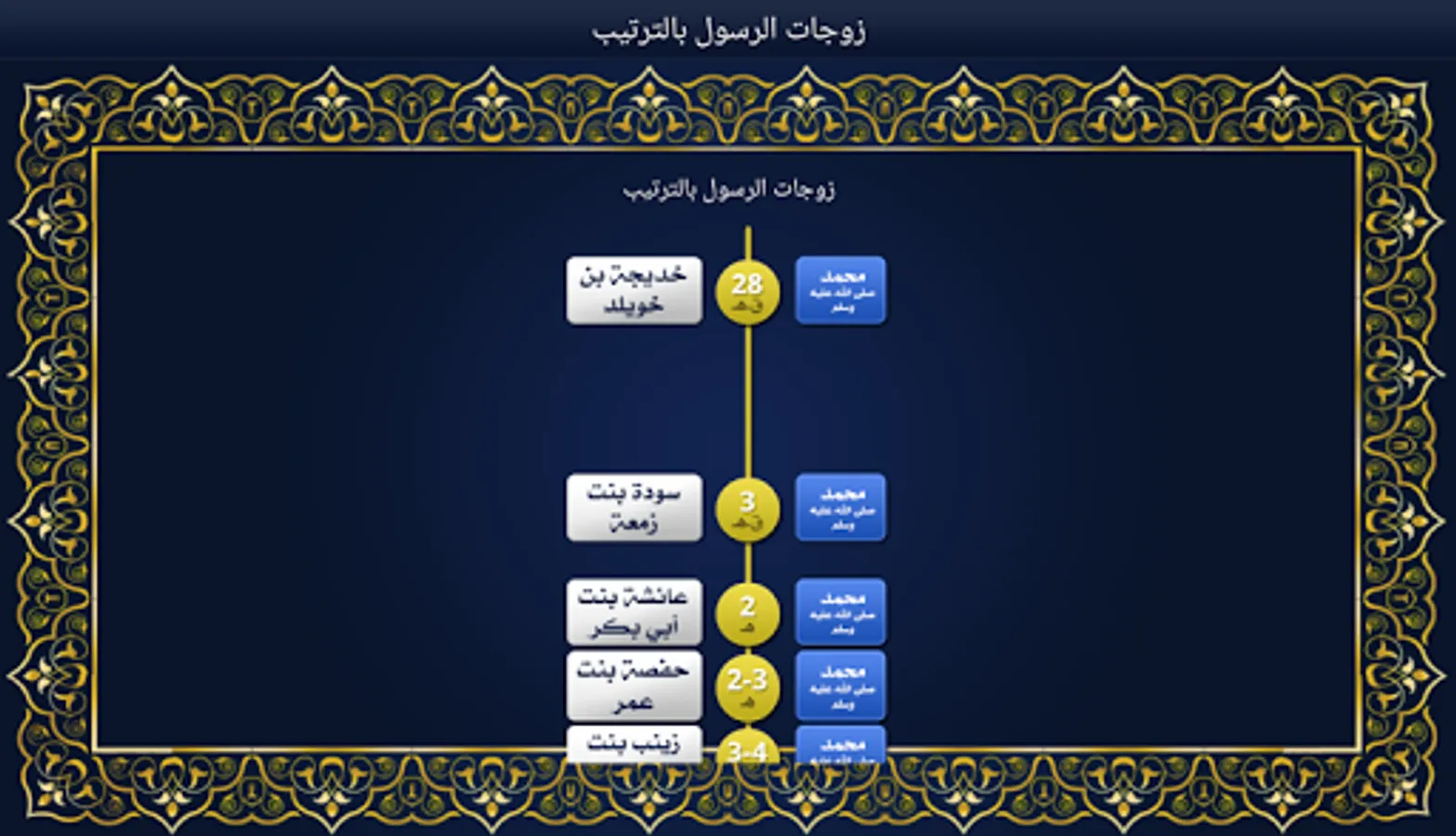 Unique in terms of the presentation of information, find the names of the wives of the Prophet in the order with the date and Hijra year application, and that the chronology form, not only that but you can click on the name that manages and receives information on all pairs Apostle beloved wife, and number of children, date of birth and death and ratios her age and married to the Messenger of Allah.