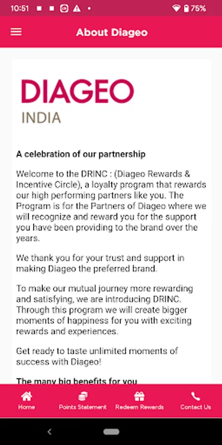 Welcome to the DRINC : (Diageo Rewards & Incentive Circle), a loyalty program that rewards our high performing partners like you. The Program is for the Partners of Diageo where we will recognize and reward you for the support you have been providing to the brand over the years.