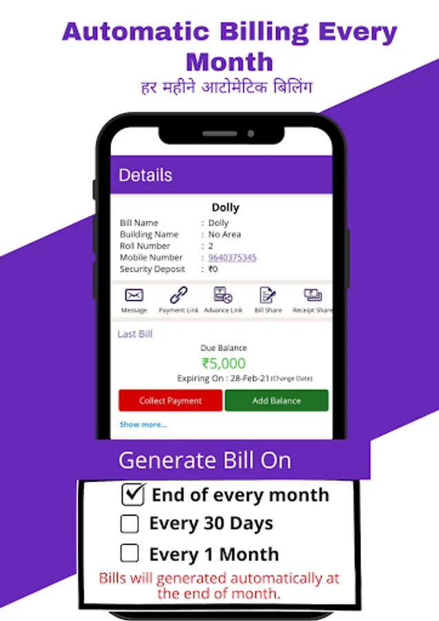 • The bills get generated on the date fixed automatically. Customers will receive SMS on their phone about the amount due and the method by which they can pay the bills. You can even set reminders to remind the customers to repay their dues on time.