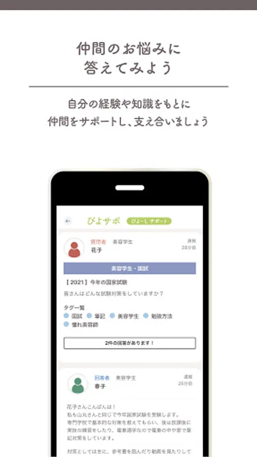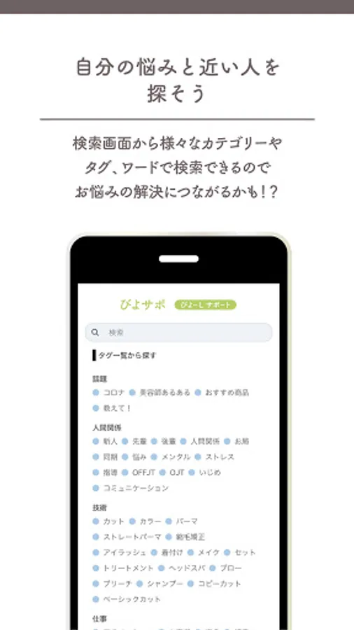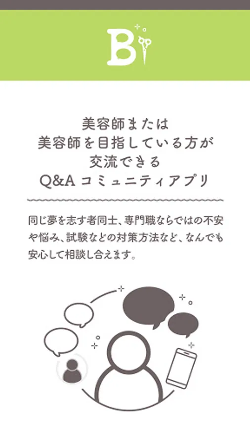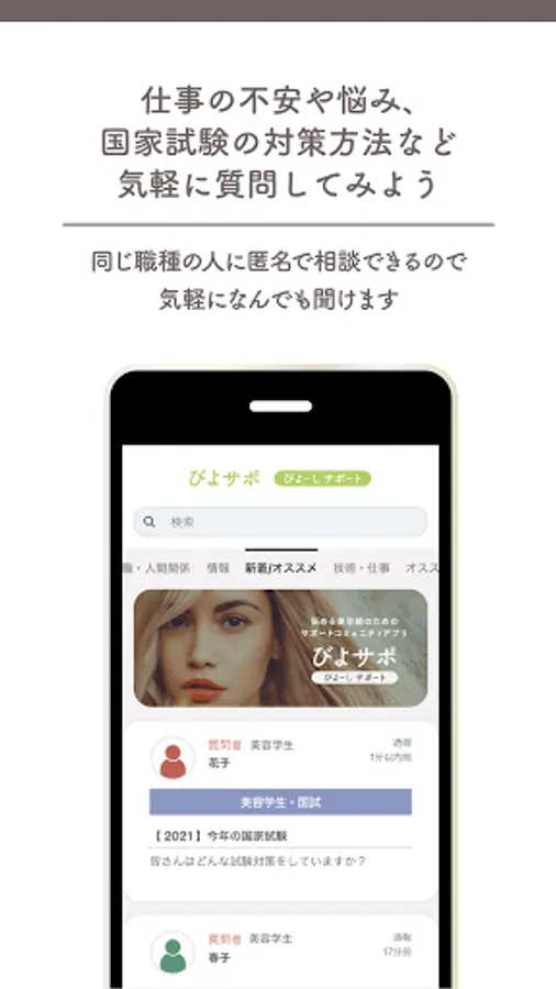 "Biyo Support" is a Q & A community app that allows beauticians or those who are aiming to become beauticians to interact with each other. "Biyoshi Support Biyo Support" is a place where you can solve questions, consultations, and feelings that are unique to the industry with friends who can understand each other, support each other, support each other, and grow together.