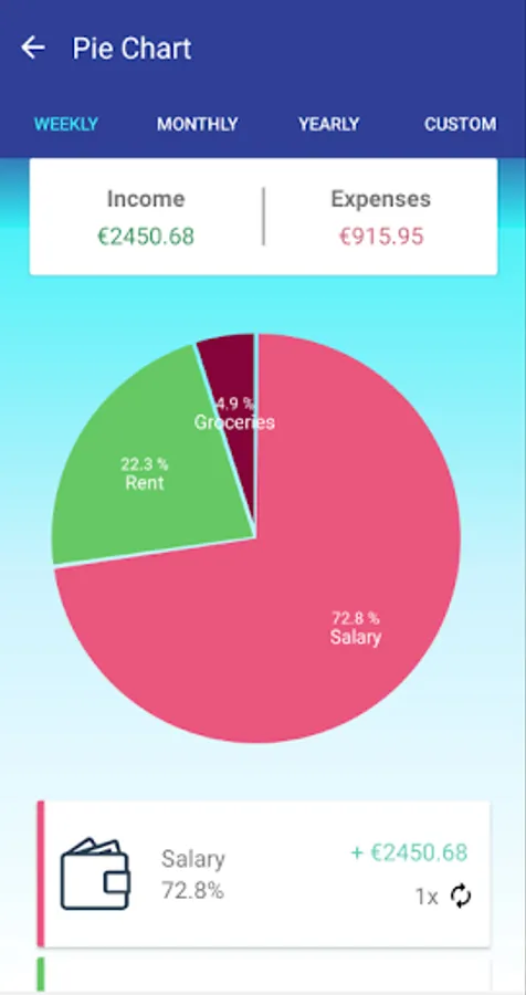 - See your spending distribution for a week, month, year, or a specific date range in an informative Pie Chart
