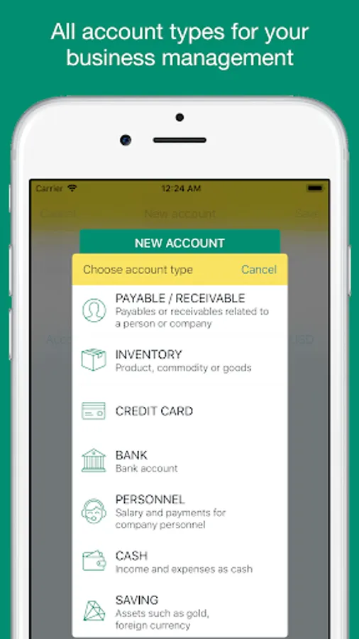 - Budget, Cash, Bank, Credit Card, Inventory, Stock, Personnel, Saving, Payable / Receivable accounts