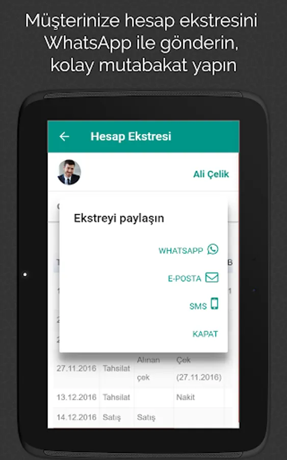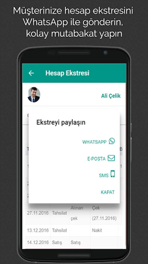 • Ayrıca tek tıkla hesap ekstresi oluşturabilir, müşteri veya tedarikçinize online mutabakat mektubunu Whatsapp/SMS/e-mail yolu ile gönderebilirsiniz.