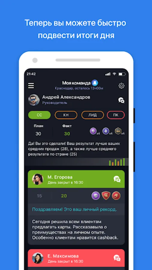 Now, daily goals are set in the sales accelerator, the employee can send subtotals several times during the period. The accelerator of sales itself will evaluate the dynamics of sales, make a conclusion about the results of work and note every achievement of the employee.