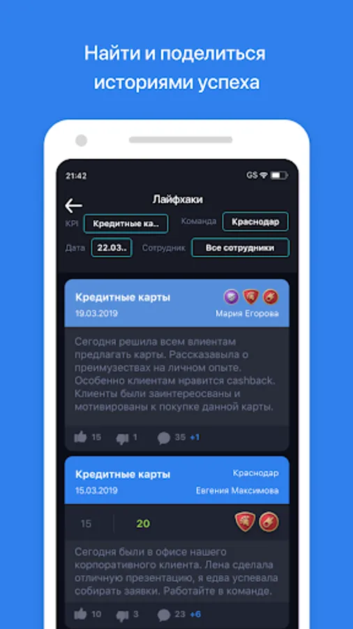 Best practices and business hacks of all participants are stored in the Accelerator of sales in the context of KPI and are available for selection by filters.