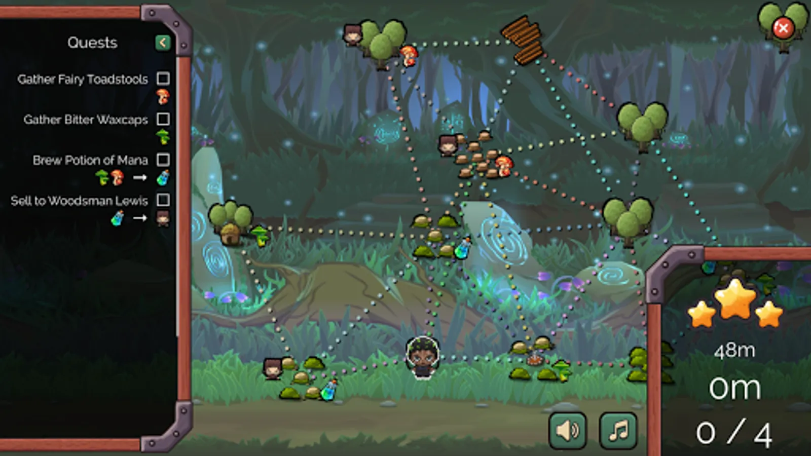 Fetching Alchemist is a puzzle game inspired by the challenge that a quest log full of fetch quests presents: How can you visit each place you need for your quest list in the most efficient order?
