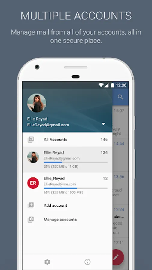 All Accounts in One – Manage emails from Gmail, Google Apps, Outlook, Office 360, Yahoo! Mail, AOL, iCloud or any other IMAP server.