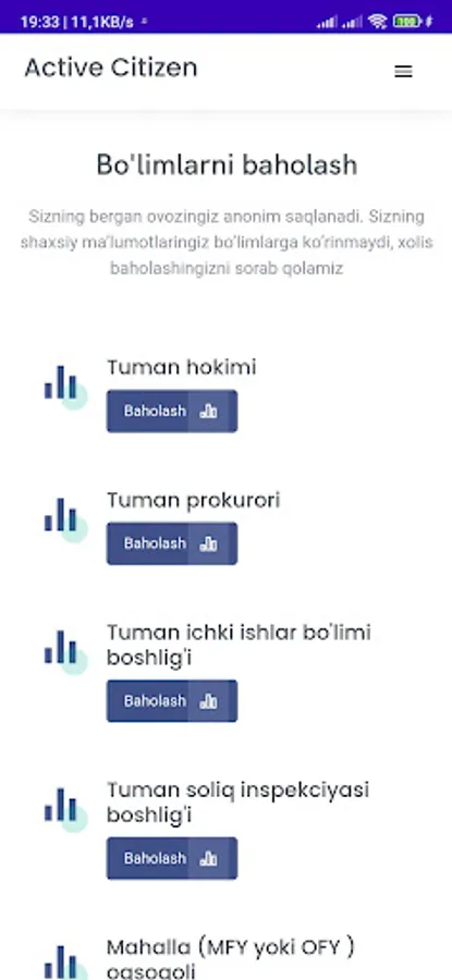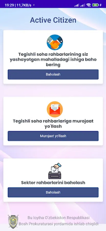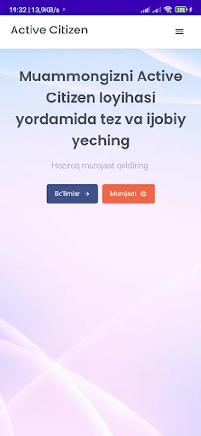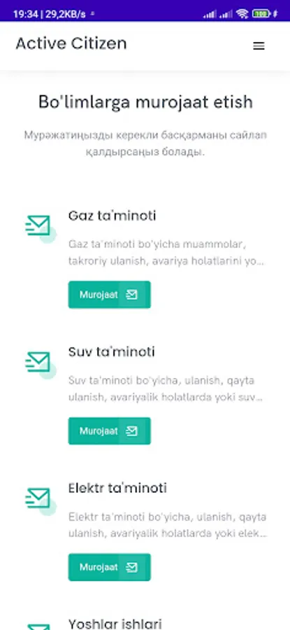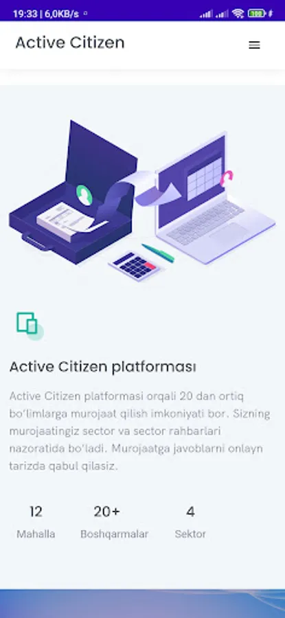 Active Citizen platforması arqalı 20 dan artıq basqarmalarǵa múrájat jollaw imkaniyatıńız bar. Sizdiń múrájatıńız sektor hám sektor basshıları qadaǵalawında boladı. Múrájatqa juwaplardı onlayn túrde sheshim hám maǵlıwmat alasız.