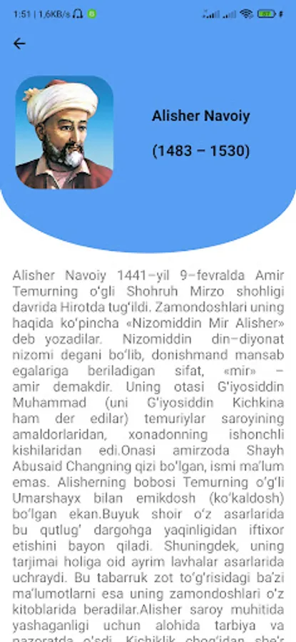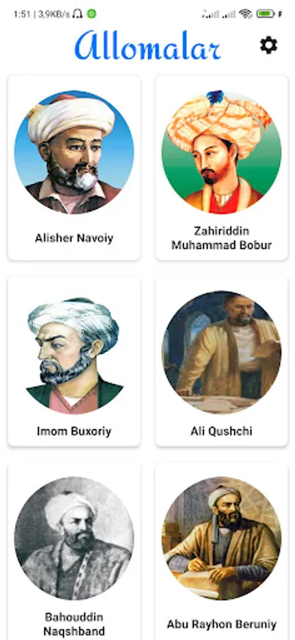 Bu ilova orqali siz Alisher Navoiy , Abu Ali ibn Sino , Zahiriddin Muhammad Bobur va boshqa buyuk o'zbek allomalari hayoti va ijodi haqida ma'lumot olishingiz mumkin.
