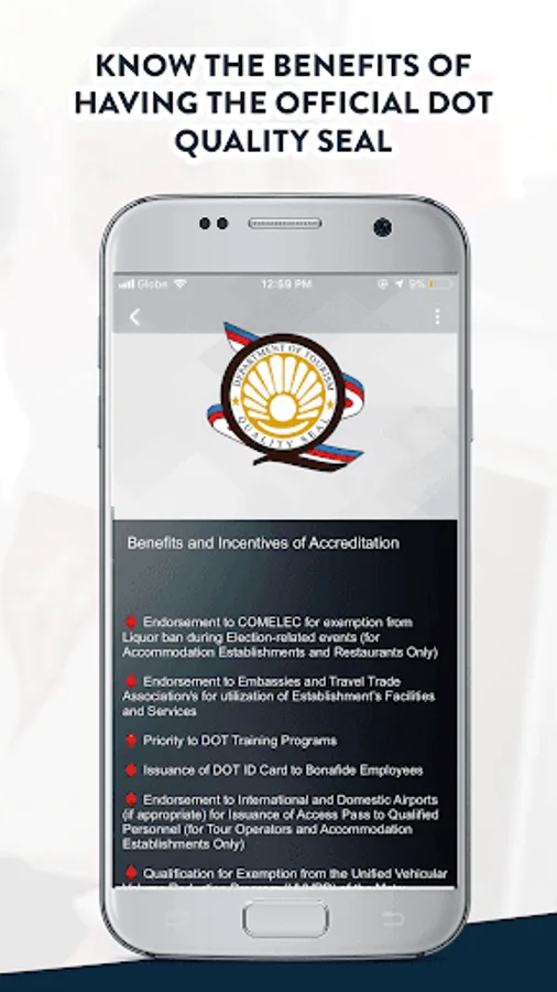 The app also caters to business owners applying for accreditation, providing them with information on requirements and application status. It also provides a list of accredited establishments for travelers to avail of services from trusted businesses.