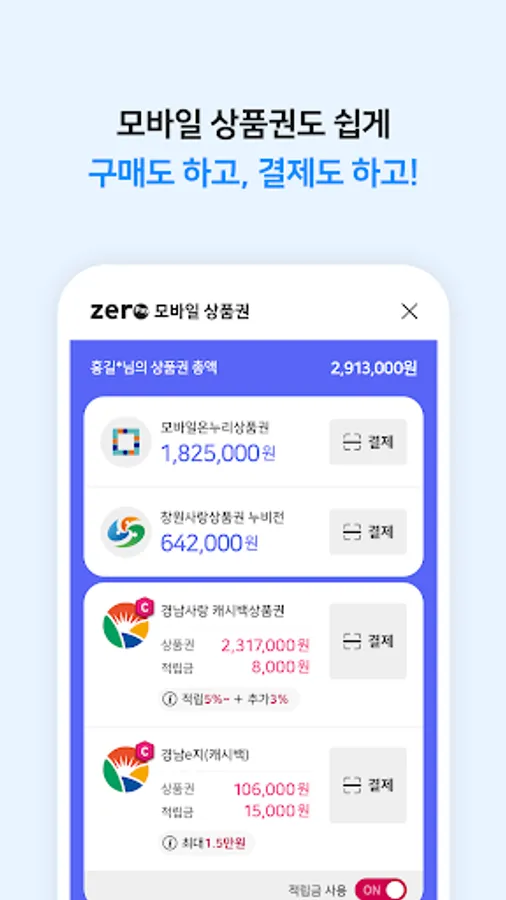 -Mobile gift certificates: Onnuri gift certificates and mobile gift certificates issued by local governments in Changwon, payment, purchase, usage history management, refund, gift, etc.