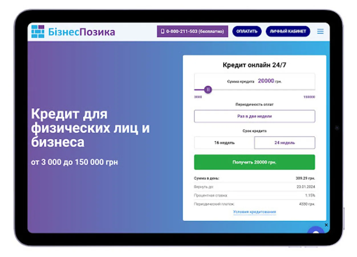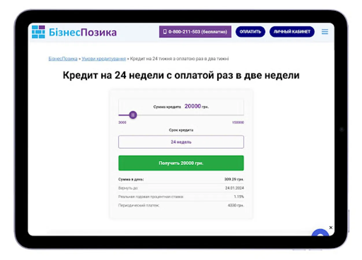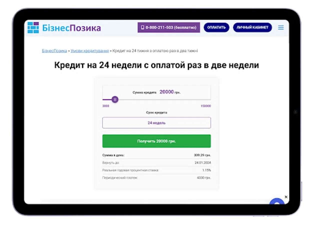 Card credit for individuals 24/7, from UAH 3,000 to UAH 150,000. The loan term is 16/24 weeks or 113/169 days. Frequency of payments: once every two weeks