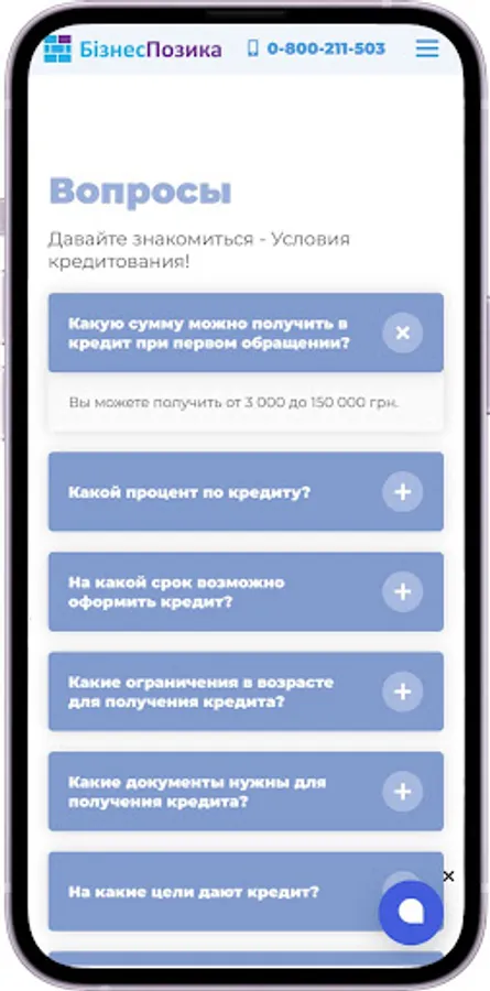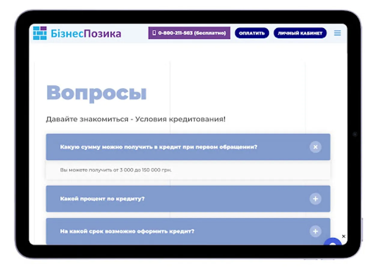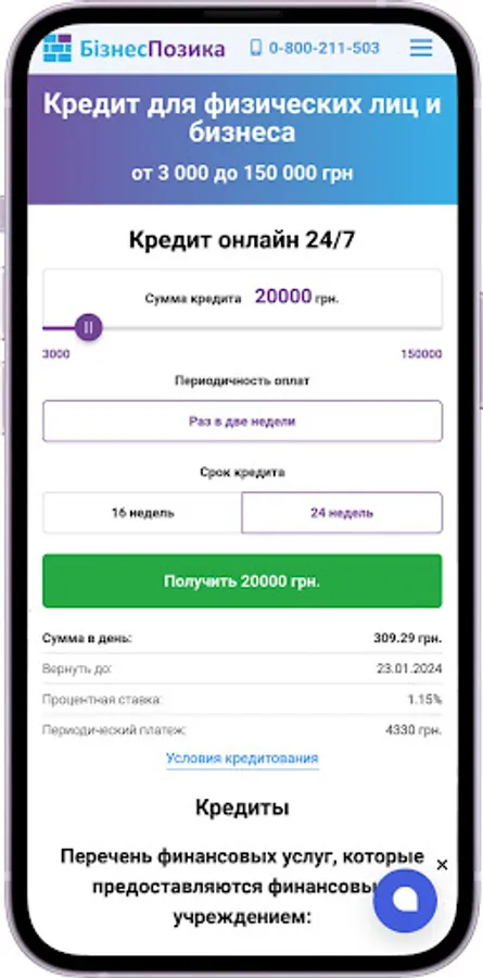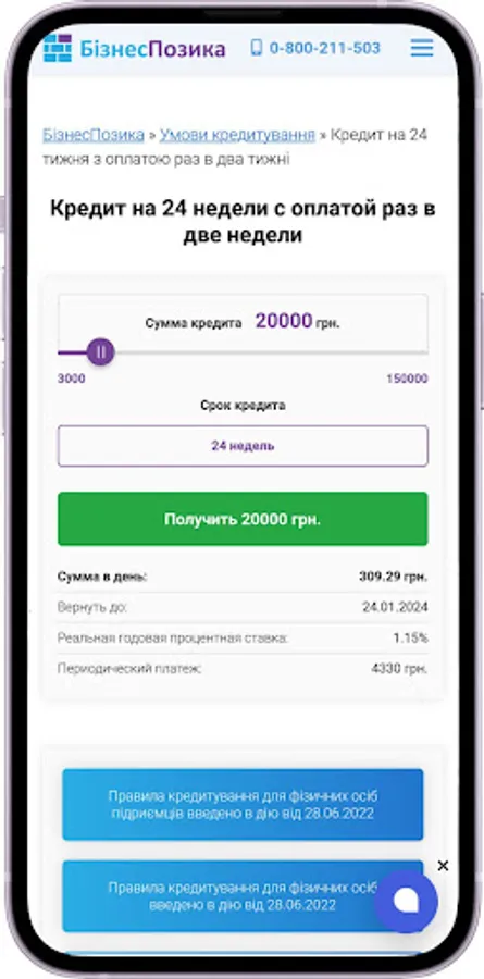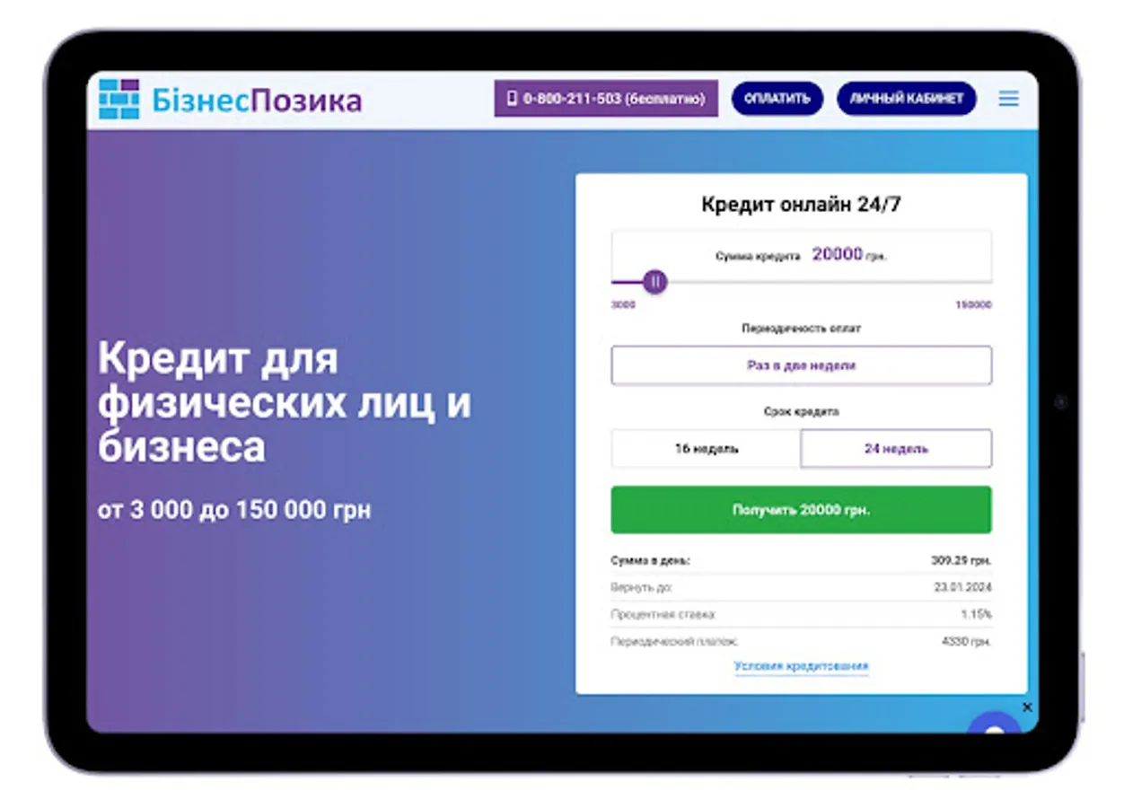 Card credit for individuals 24/7, from UAH 3,000 to UAH 150,000. The loan term is 16/24 weeks or 113/169 days. Frequency of payments: once every two weeks