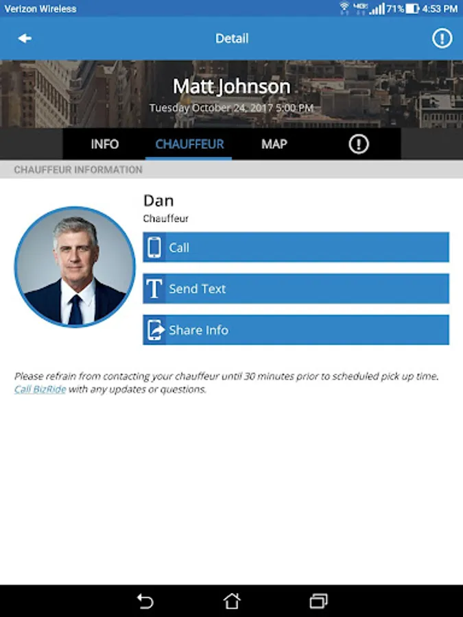 Having trouble locating your chauffeur? Left something in the vehicle? Service not up to your standards? CALL US! We are here for you 24/7 to provide support. In this world full of technology, people still matter. Download BizRide today!