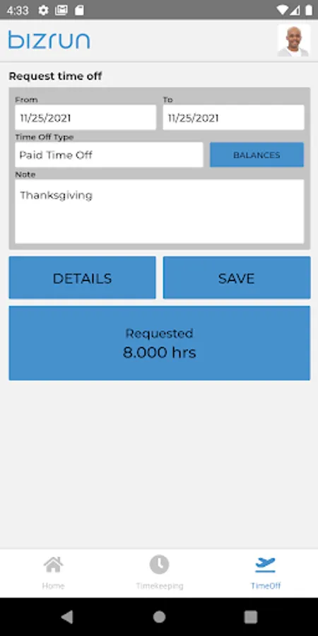 Time to rejoice. With time-off planning on your employee’s phone you can forget about spreadsheets and other manual methods of keeping track of vacations and sick days. BizRun provides up-to-date information on balances, upcoming requests, and past days off based on your defined PTO policy. Plus, the requester is automatically alerted if their request exceeds their accruals. Here’s more: