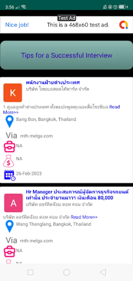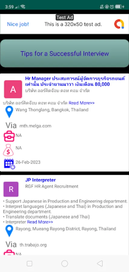 The ability to collect and compile Jobs from different sources, all top leading job advertising sites and recruitment agencies in th.whatjobs.com, www.recruit.net, th.trabajo.org, jobs.laimoon.com, www.trigyn.com, www.jobthai.com, th.jooble.org, www.rgf-hragent.asia, mth.melga.com, www.themuse.com, www.thaiyello.com, m.timesjobs.com, talentvis.com, www.talentvis.com, careers.swe.org, www.hoteljob.in.th, www.michaelpage.co.th, jobs.ericsson.com, th.linkedin.com, www.jobbkk.com, careers.allianz.com, careers.banpu.com, www.argyllscott.com.hk, careers.underarmour.com, startup.jobs, th.joblum.com, 7peakssoftware-hr.freshteam.com, indevjobs.org, careersatagoda.com, www.jobtopgun.com, www.argyllscott.vn, jobs.smartrecruiters.com makes this job search app to be the reliable app for the latest Thailand job adverts.