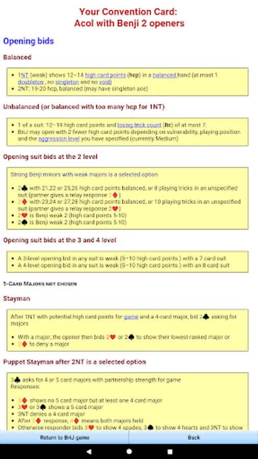 BJ Bridge Beginner is a contract bridge card game with unique duplicate bridge competitive scoring features. It offers a choice of Benji Acol, Level 1 Acol as taught by the EBU and Standard American Beginner systems of bidding.