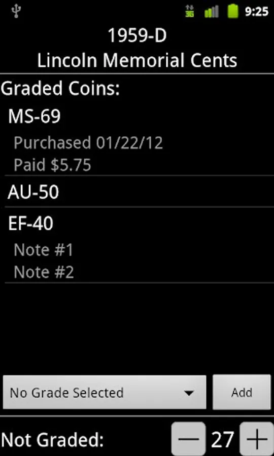 Keep track of your coin collection with ease! It doesn't matter if you have a small collection or a large collection. This app is especially useful if you are a collector on the go! Don't worry about buying a coin you already have in your collection ever again. Now you always have a coin list in the palm of your hand! It even allows you to keep track of the graded coins in your collection. No Internet connection required!