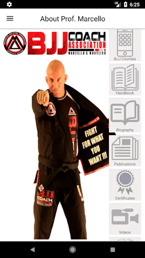 The BJJ Coach APP is divided into sections containing information about Prof. Monteiro and his role in the history of the sport of Brazilian Jiu Jitsu.