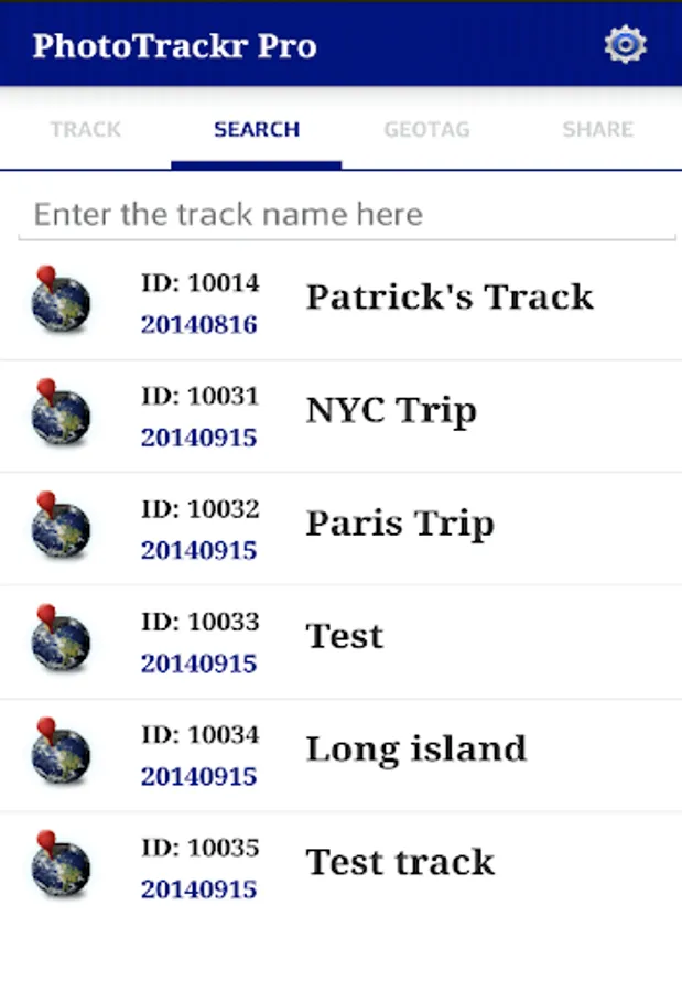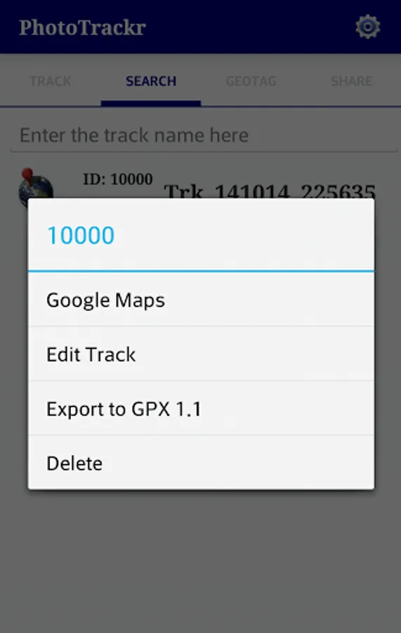 You can see the list of GPS records. You can search for a track by its name. If you tap an item, it will show the track information in detail. If you long-tap an item, a dialog box with 3 items - Google Maps, Export to GPX, Delete - will pop up. Tap Google Maps, it will show the location markers of the track on Google Maps. Tap Export, it will export the record to GPX xml. Tap Delete, it will erase the GPS record.