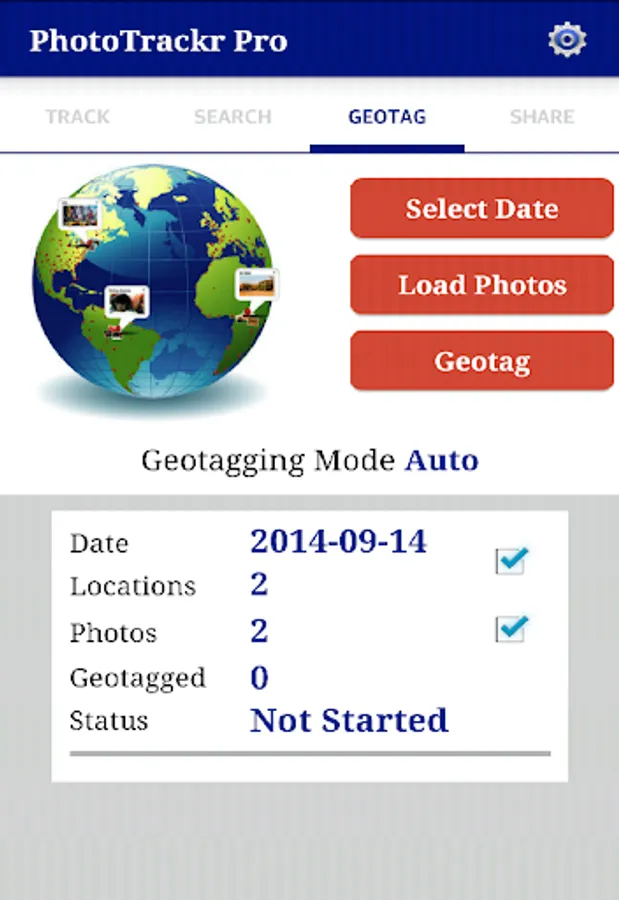 ((Auto Mode)) *IMPORTANT* Geotagging works correctly only for photos taken during the GPS tracking. Second, tap “Select” in order to select a track date. Third, tap “Load” to select photos from your phone. Finally, tap “Start” to geotag your photos based on GPS data you loaded.