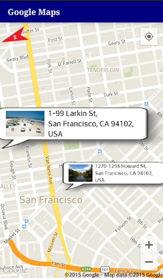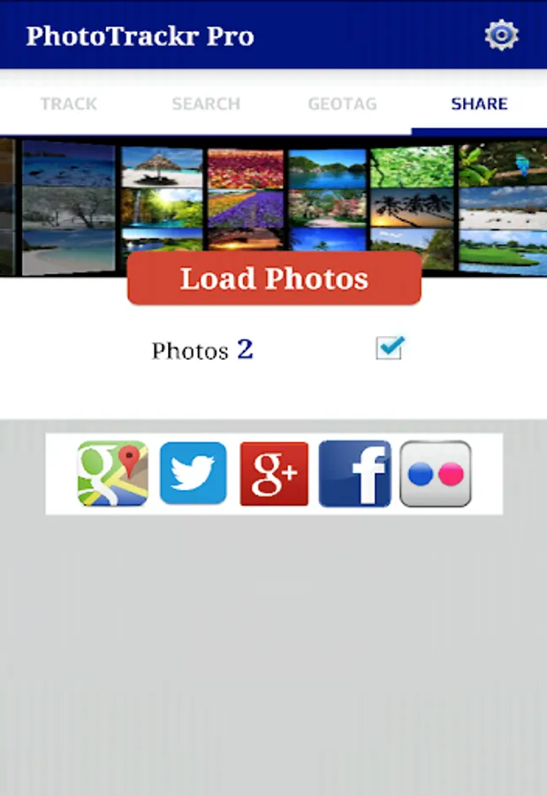 Load geotagged photos first then tap Google Maps icon to view geotagged photos on the Map. Or you can upload photos to Twitter and G+. You need to authorize the app to get an access to your account.