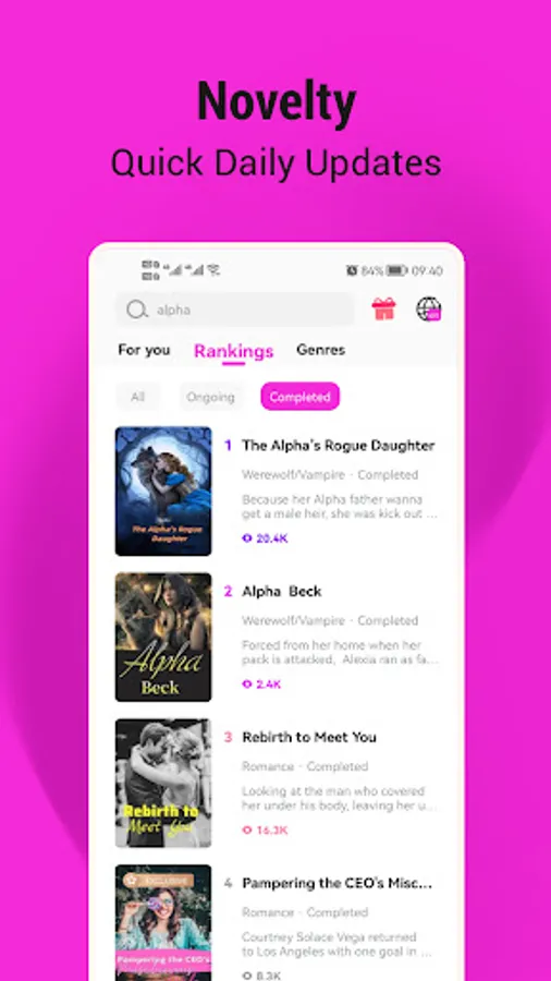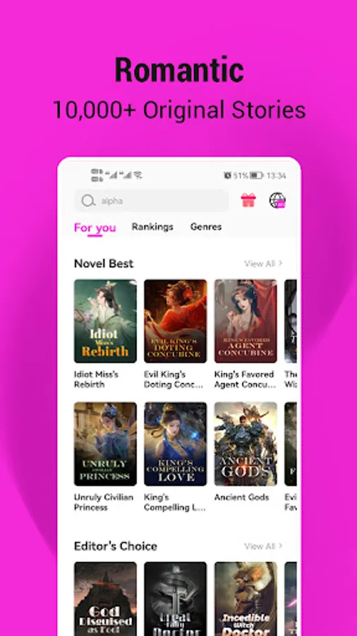 Discover addictive novels such as The Billionaire's Secret Lover, CEO & His Little Sweet Pet, Kidnapped By the Mafia, I accidentally married a Playboy and so on. With Romanfic, you can enjoy anything from dating a handsome Billionaire to immersing yourself into a world where the poor and often looked-down protagonist grows strong and rich along the way to get back at those snobbish people. Not your cup of tea? Perhaps something a bit more thrilling? There are also Alpha Carson’s Spoiled brat, The Vampire Kings And Their Little Mate and other hot fantasy novels for your choosing.