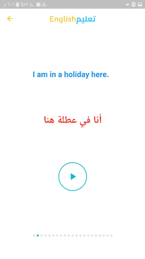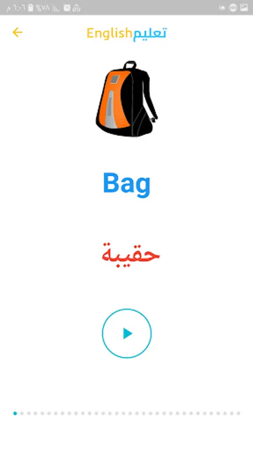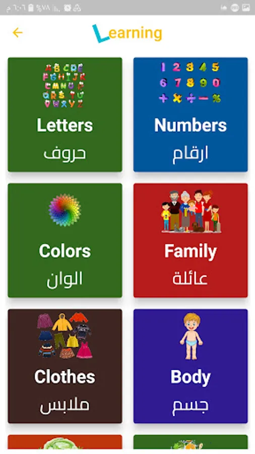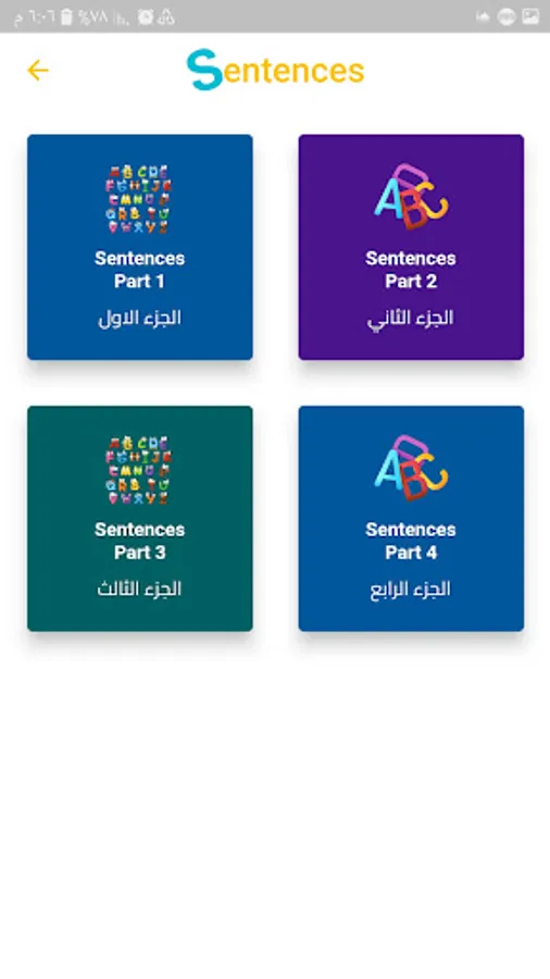 The application consists of 5 sections, which are (learning, sentences, exercises, spelling, tests) and each section consists of 10 branches (numbers, family, colors, things, animals, letters, fruits, vegetables, body, clothes), and each category contains ten words or more supported by an illustrative picture with a sound for each word and sentence in the voice of children, and the sentences branch consists of 4 parts,