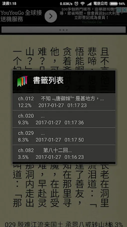 * 書籤列表內所示書籤:(短按)是選取,(長按)是删除該書簽。
