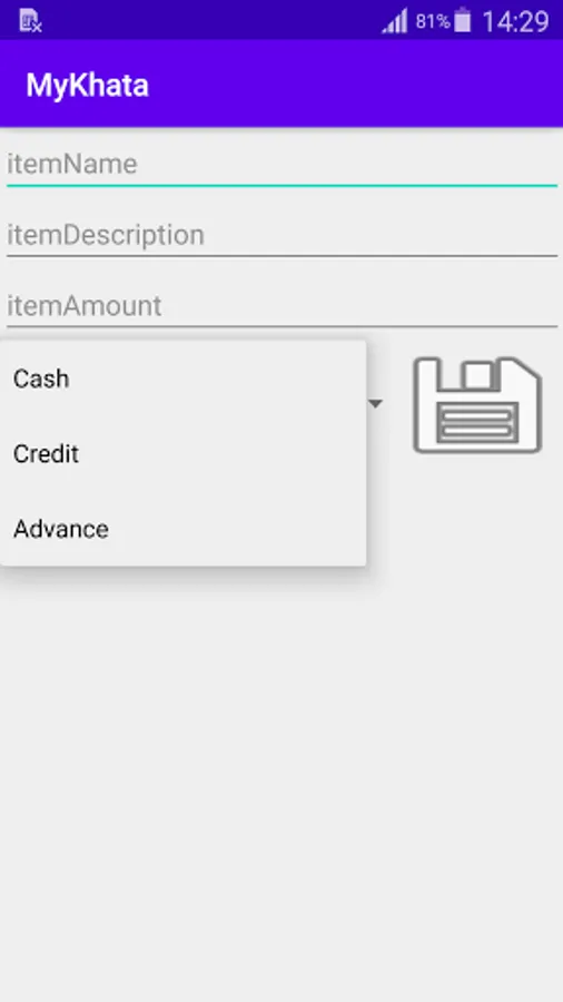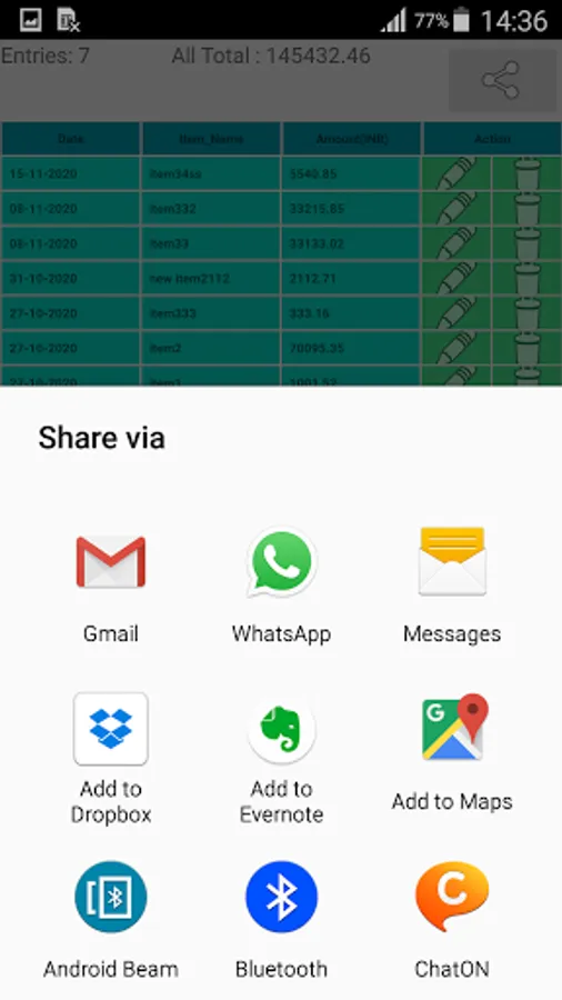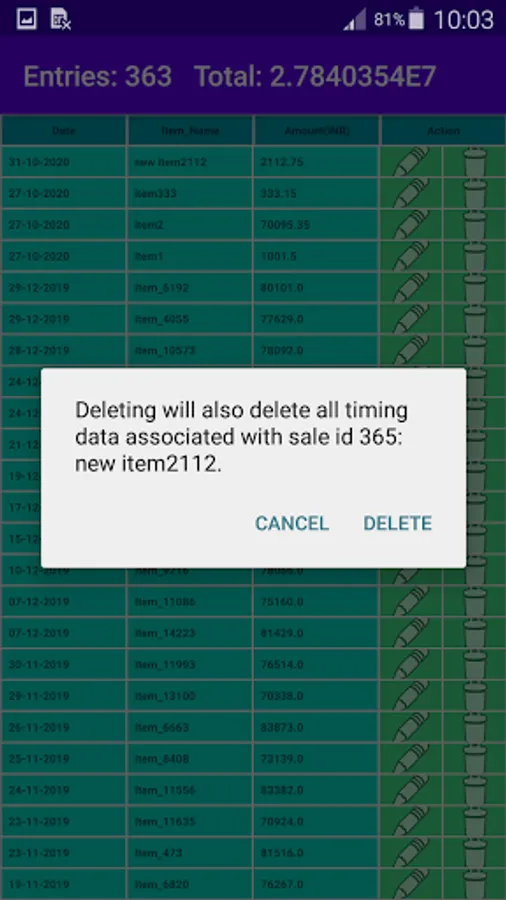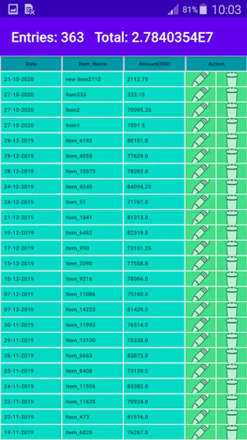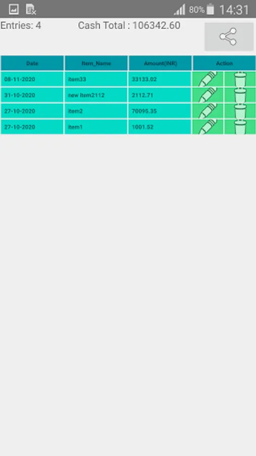 This app can be used to enter the sale records with item_name, item_description and amount. To view the date-wise entries we have a check activity with edit and delete option. We also have an option to get a report of entries during a specified period.