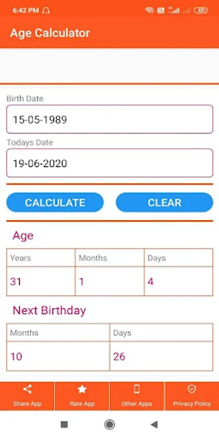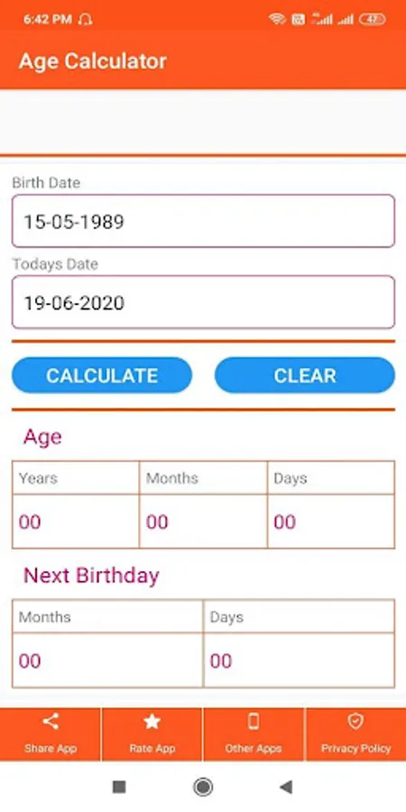 This application provide a simple user interface easy to use. just pick your birth day Age Calculator provide your total age and next birthday upcoming birthday.