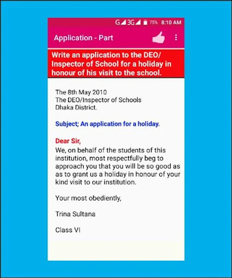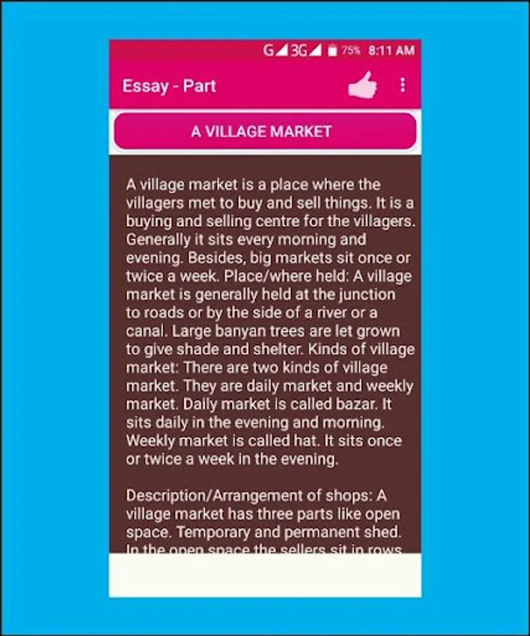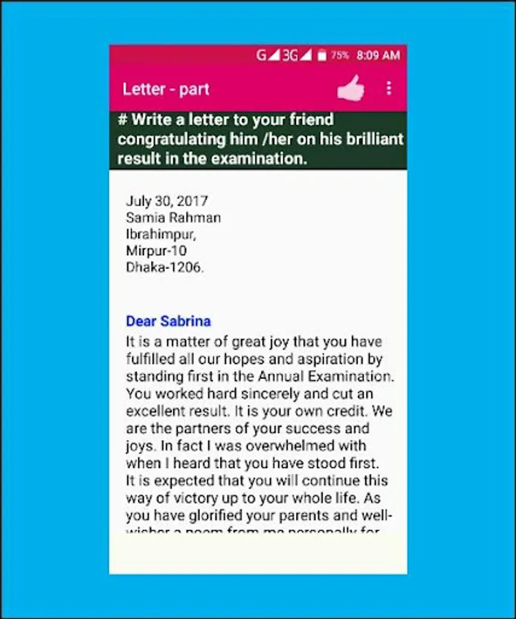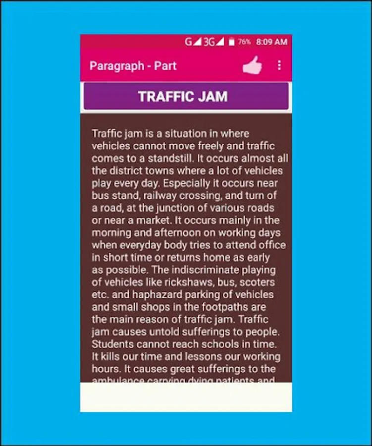 Paragraph,Letters, Application, Essay, Short stories writing is very much important while learning English. There are many books in market that helps to read paragraphs,Letter, Application essay & Short Story. But the collection of those books are very little in number. Because this is the first time we made Composition Part application specially for PSC.JEC SSC & HSC Student. There are 350 Paragraph, Letters, application, Short Stories & Essay in this app. This app is made for Bangladeshi Students. But it can help every countries students especially Indian, Pakistani, Sri-Lankan, Nepali than others countries. This contains Paragraphs for class three to HSC students or whoever needs. It may help teachers while teaching. They can have a look on it when they feel help