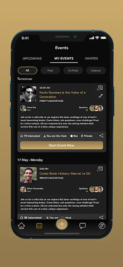 Schedule your future live events. Invite co-hosts and guest speakers, create buzz and build your community by sharing links and get direct access to people interested in your content.