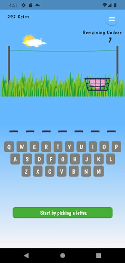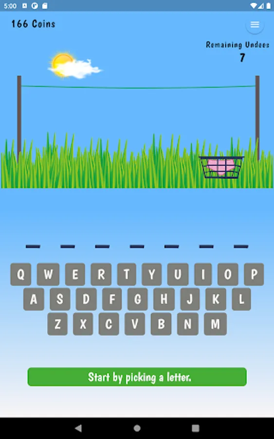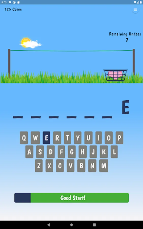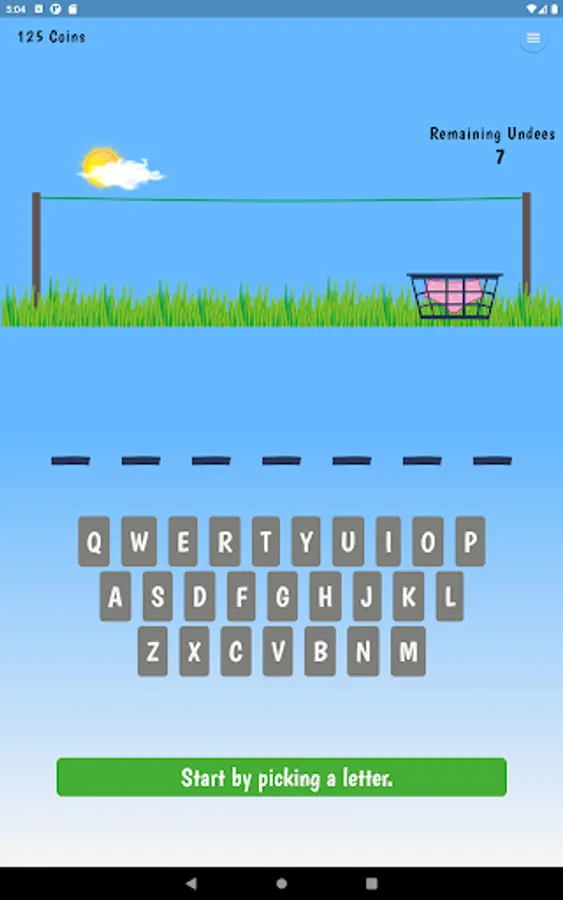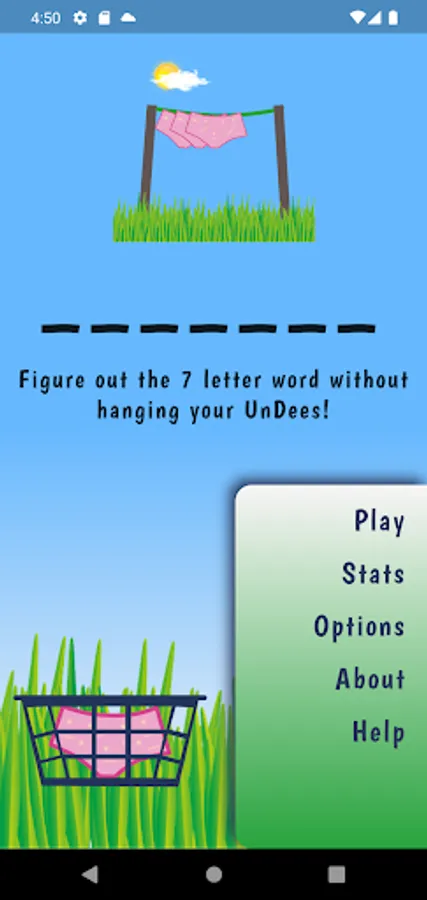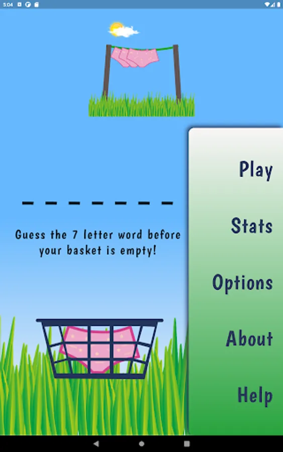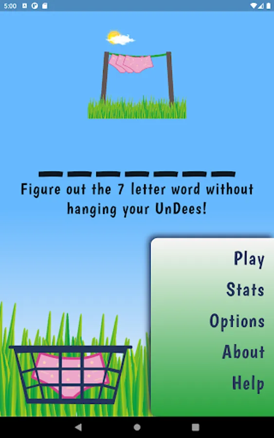 Hang 7, a friendlier version of the traditional hangman game. All words are 7 letters in length, each time you enter a letter that is not in the word, underwear (Undees) are hung on the clothesline. You have 7 pairs of 'Undees' in the basket. Guess the word before you run out!