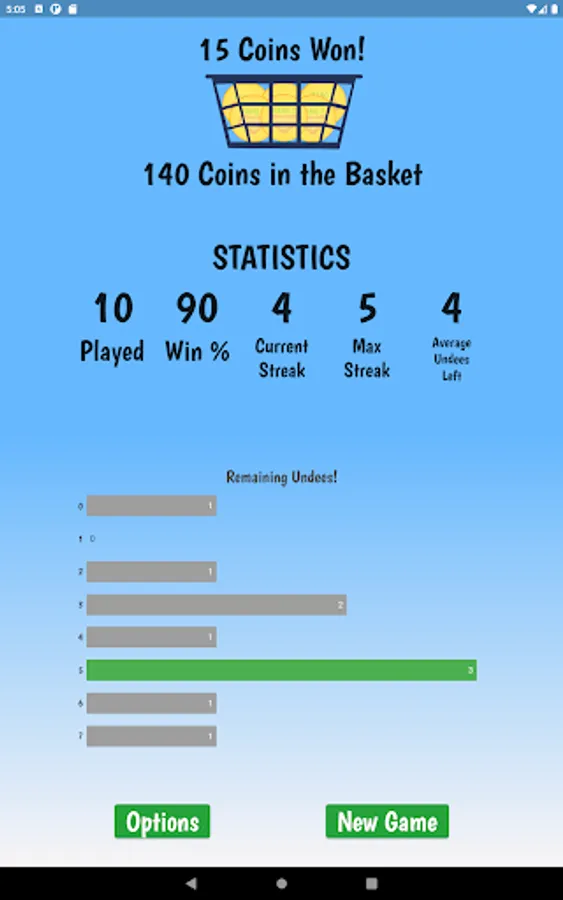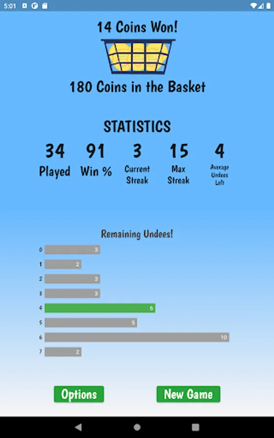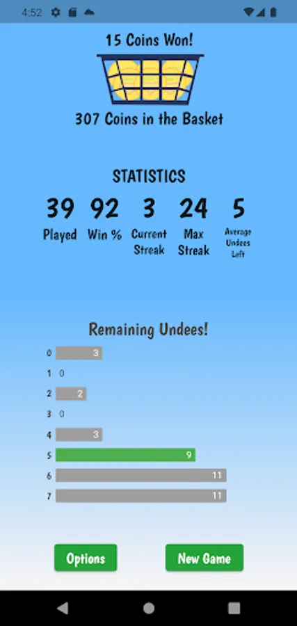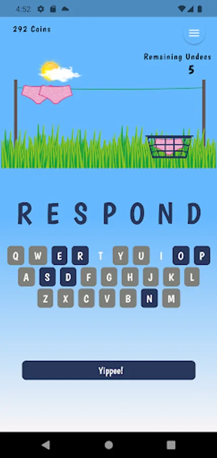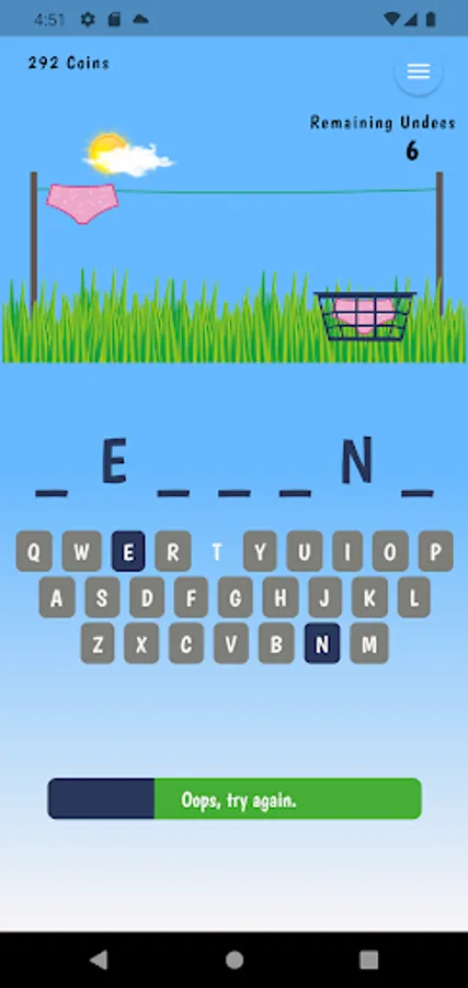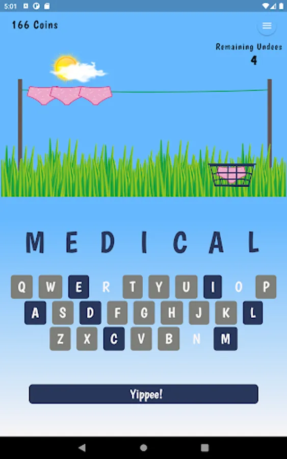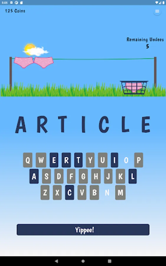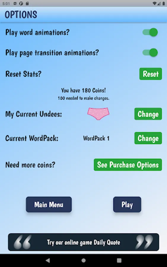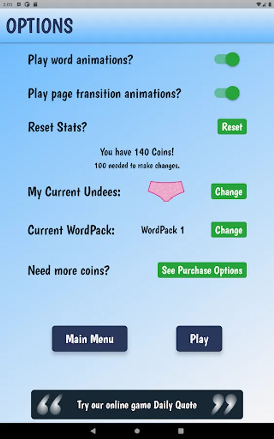 Win the game and collect coins to upgrade your style and WordPacks. The game starts with the standard pink brief and 50 random 7 letter words. You will need to collect 100 coins to change your Undees and 500 coins to get new WordPacks!
