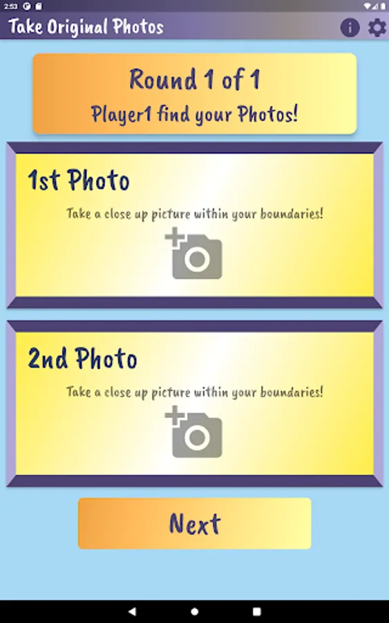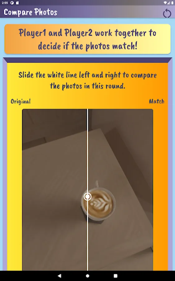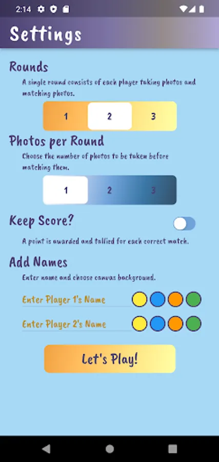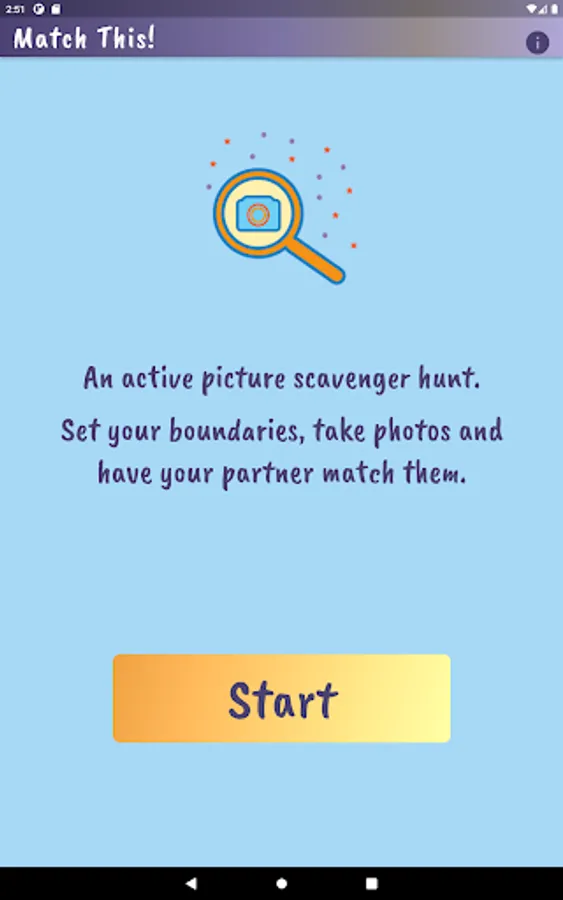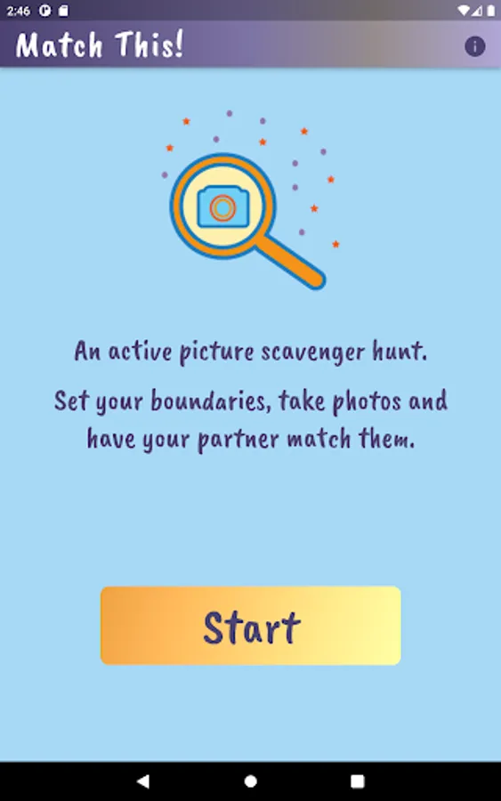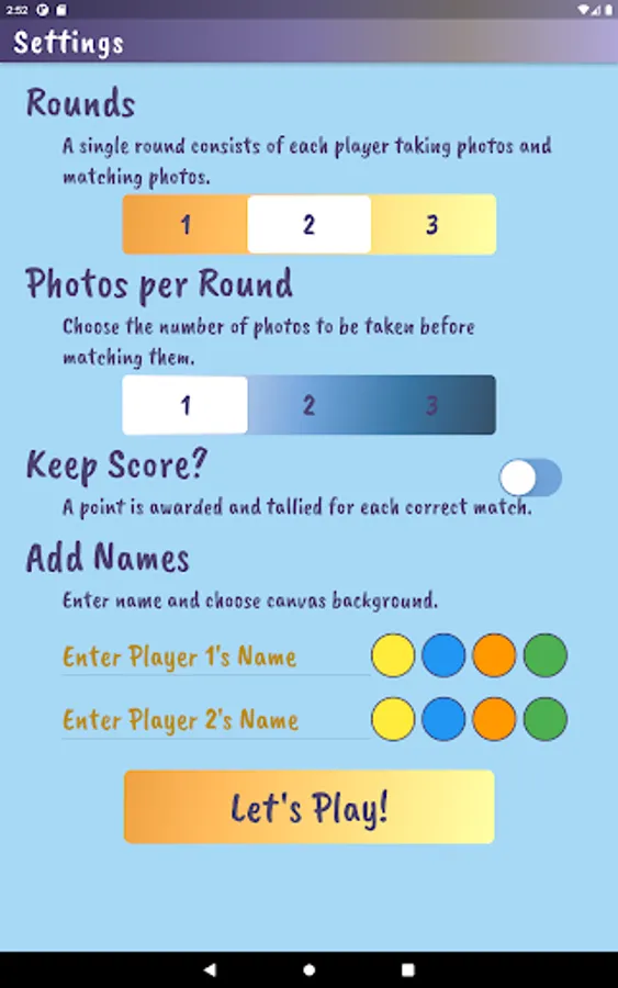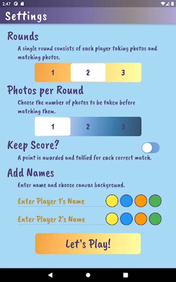 Played on the same device, players take turns using the device camera to capture closeup objects in a designated area. Player 1 takes pictures and has Player 2 tries to match it. Players compare the ‘match’ and if it is determined to be a match, a point is awarded to Player 2. Then reverse. Choose the number of rounds, pictures per round and whether or not to keep score. Players can customize by adding their name and picking a canvas color on the settings page.