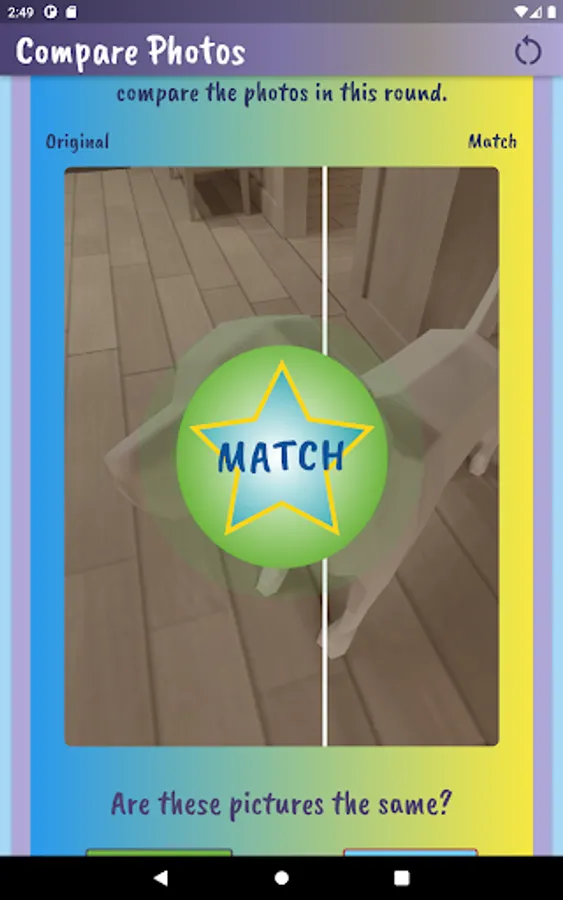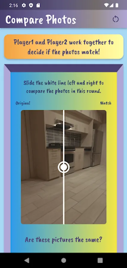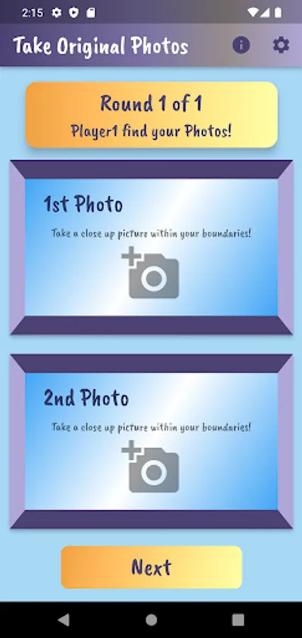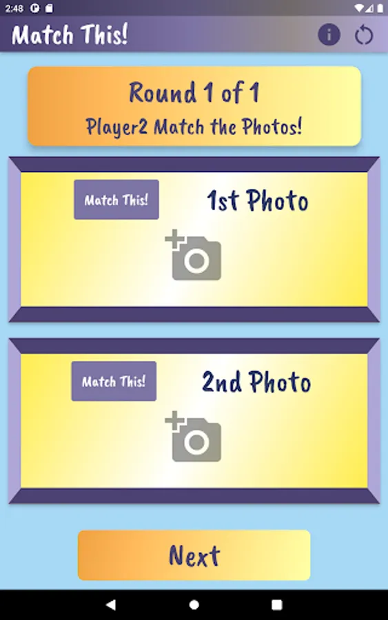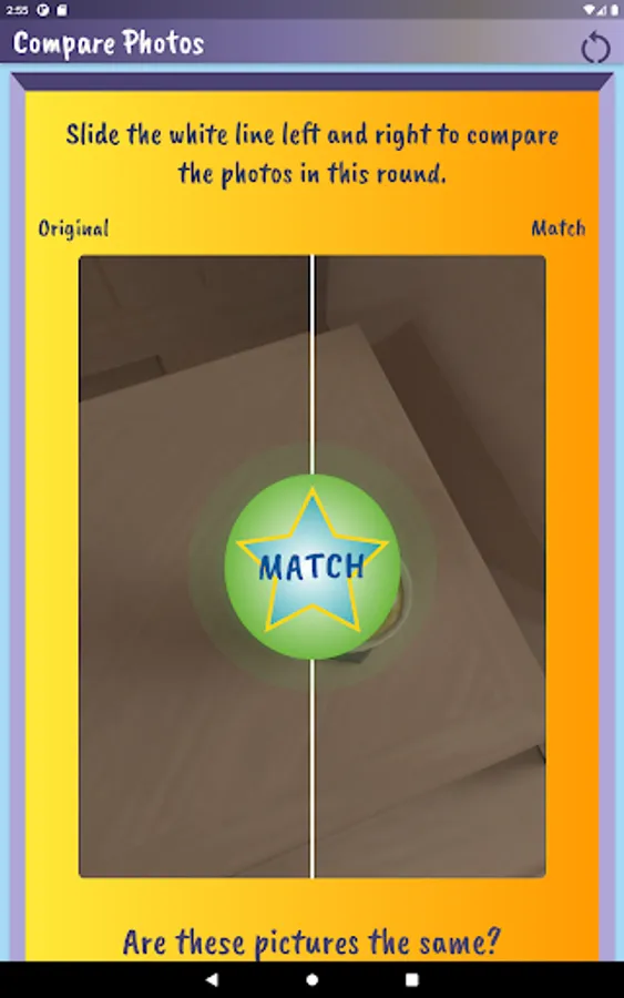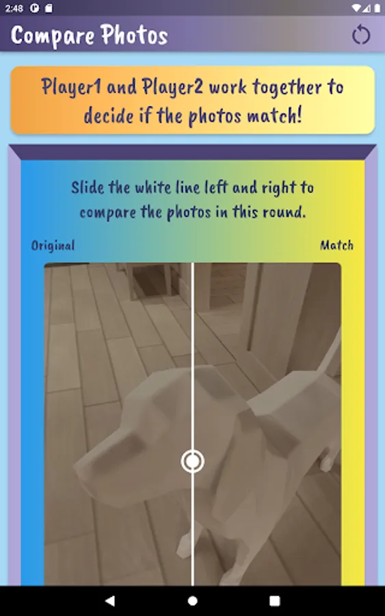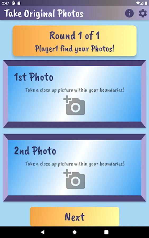 Played on the same device, players take turns using the device camera to capture closeup objects in a designated area. Player 1 takes pictures and has Player 2 tries to match it. Players compare the ‘match’ and if it is determined to be a match, a point is awarded to Player 2. Then reverse. Choose the number of rounds, pictures per round and whether or not to keep score. Players can customize by adding their name and picking a canvas color on the settings page.