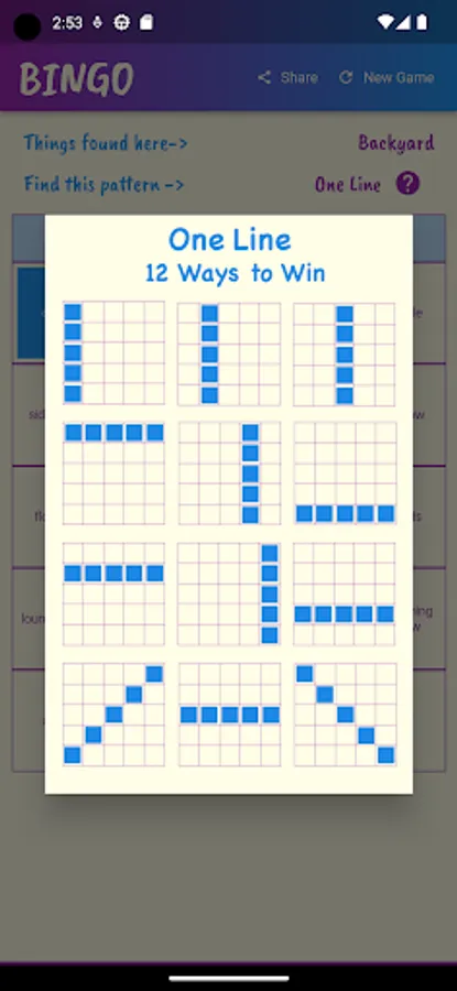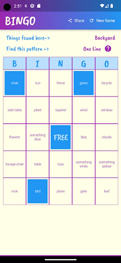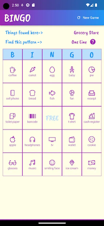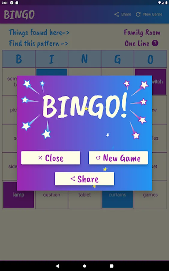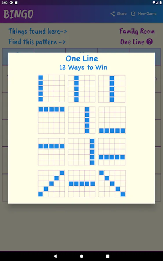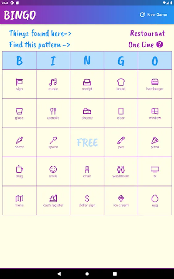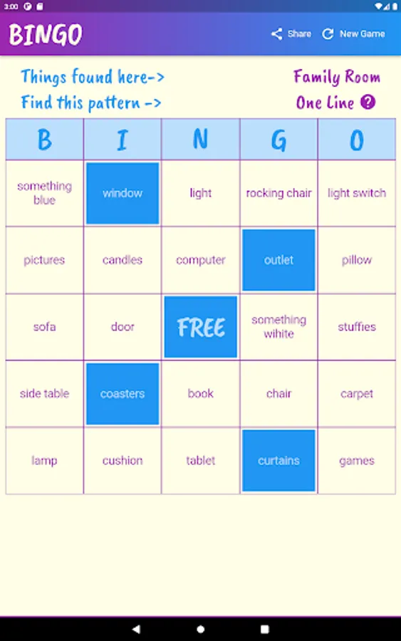 To win the game, find the items on the randomly generated card, and in the selected winning pattern. When a card is activated, 24 items are randomly placed on the board, out of a possible 35. Every card is different! Every game is a new challenge!