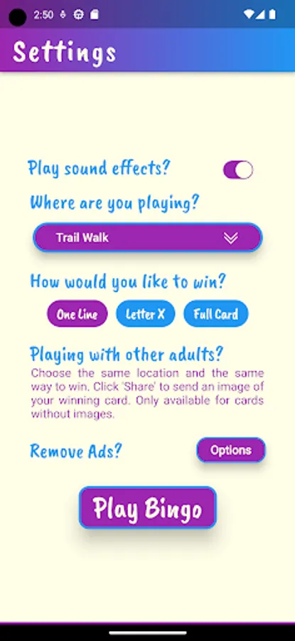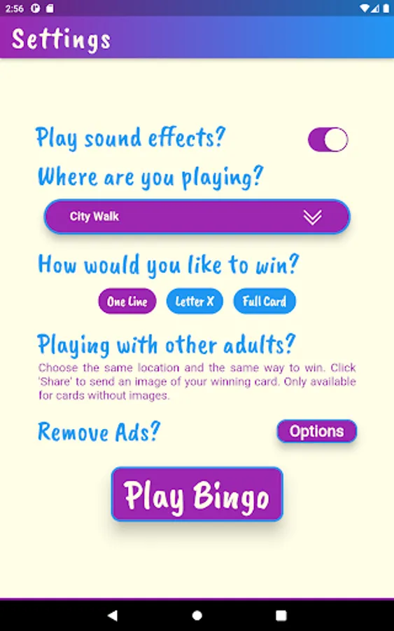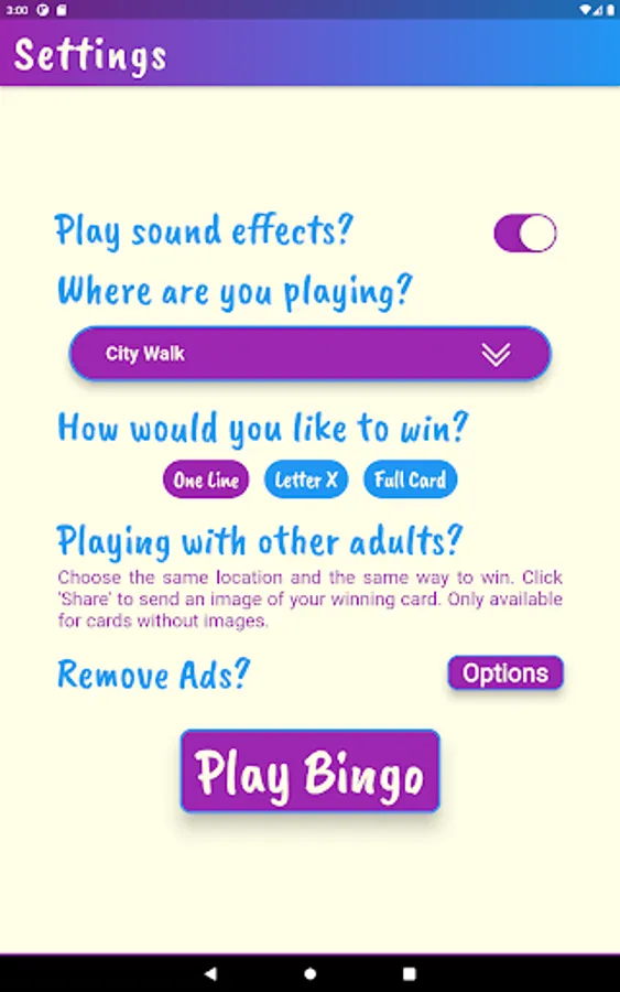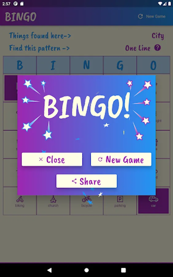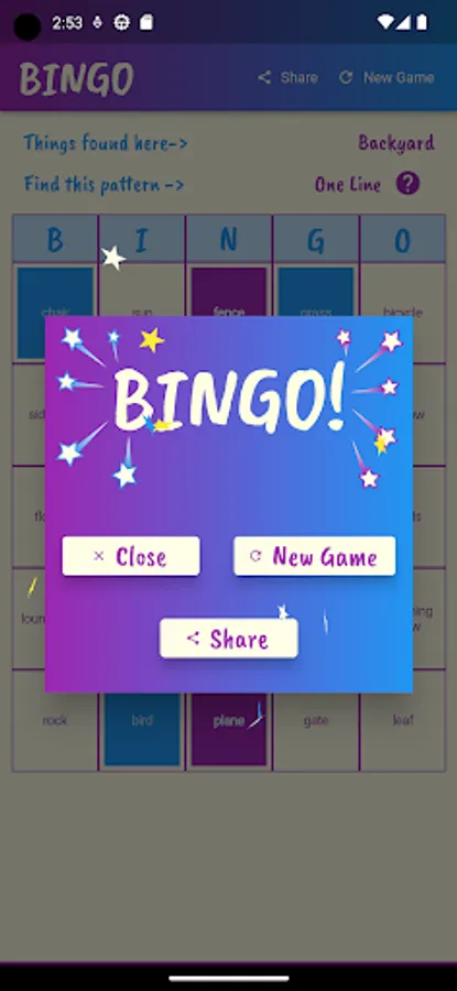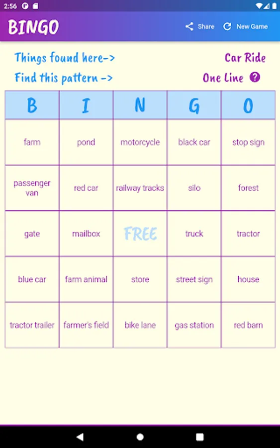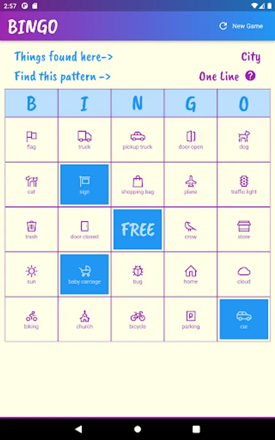 To win the game, find the items on the randomly generated card, and in the selected winning pattern. When a card is activated, 24 items are randomly placed on the board, out of a possible 35. Every card is different! Every game is a new challenge!