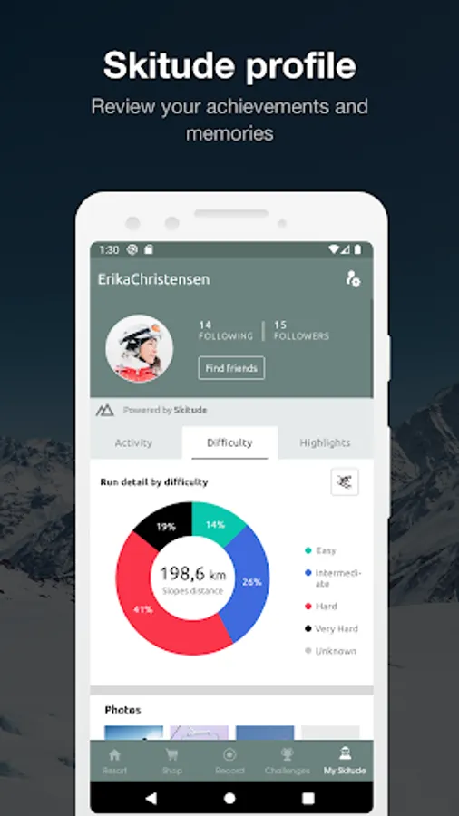 - Advanced Statistics: Improve your performance by obtaining more accurate statistics. Analyse your day’s ski information such as specific slopes data, breakdown by difficulty or check your own achievements.