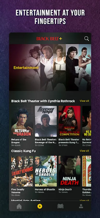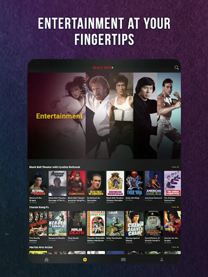 The app features an extensive collection of beloved martial arts movies and TV shows. Watch movies starring Bruce Lee, Chuck Norris, Cynthia Rothrock, Jean Claude Van Damme, Sammo Hong, and more. In exclusive sit-down TV interviews, learn from martial arts masters like Dan Inosanto, Ernie Reyes Sr, Carlos Machado, and Glover Teixeira.