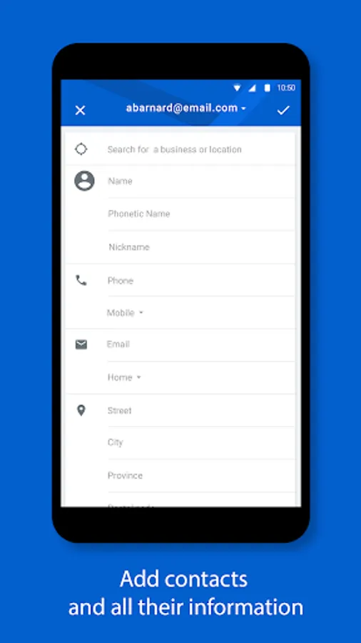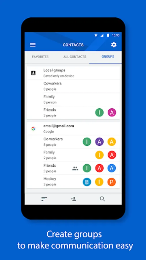 BlackBerry® Hub+ Contacts stores all your contact info in one location for convenient management. Within the app, view your contact details (such as phone numbers and email addresses) and calendar events that you share with a contact. You can also create and manage contact groups.