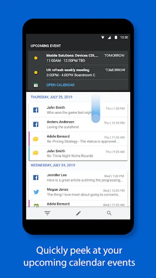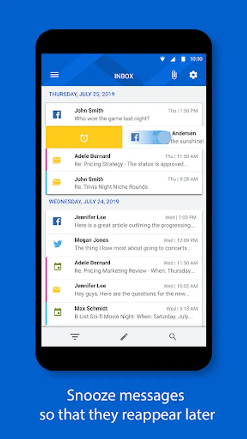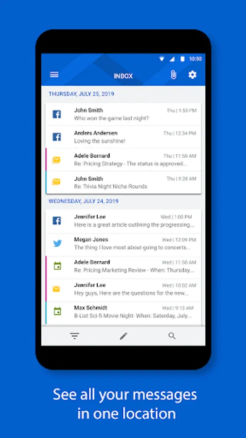 Inbox consolidates all your emails and calendar events in one unified app, and Inbox seamlessly integrates social notifications from Facebook, WeChat, Twitter, LinkedIn, WhatsApp, and more.