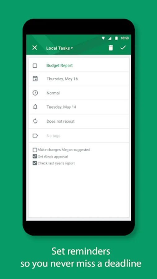 Create tasks and to-do lists with due dates, and receive reminders to help you meet your deadlines.