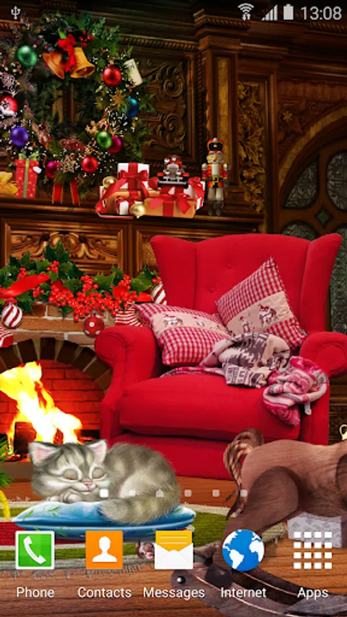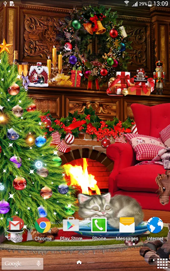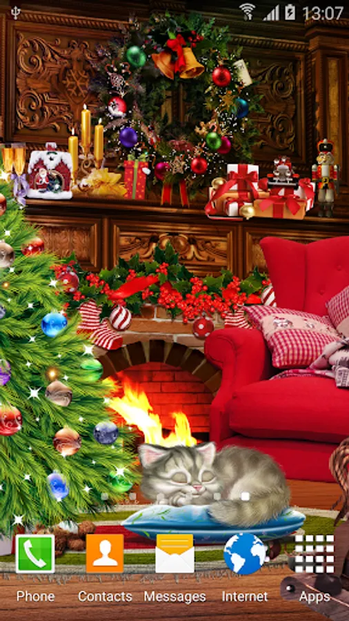 Christmas live wallpaper is a beautiful free android animated wallpaper with animated Christmas tree, dynamic Christmas lights, animated fireplace, animated sleepy kitten and much more. This free desktop wallpaper will be a perfect decoration for your android phone or tablet home screen during long winter evenings and winter holidays: Christmas and New Year.