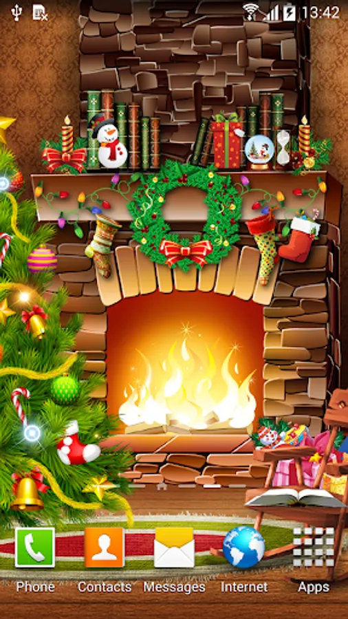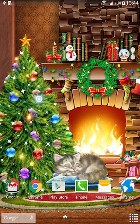 Christmas live wallpaper is a beautiful free android animated wallpaper with animated Christmas tree, dynamic Christmas lights, animated fireplace, animated sleepy kitten and much more. This free desktop wallpaper will be a perfect decoration for your android phone or tablet home screen during long winter evenings and winter holidays: Christmas and New Year.