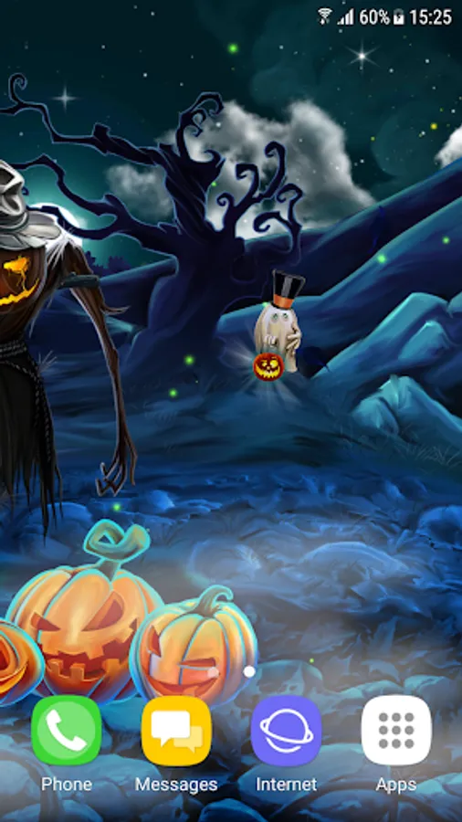 An animated screensaver "Spooky Halloween live wallpaper" for Android phones and tablets will create atmosphere of Halloween night for you. Lots of settings and dynamic effects will give your smartphone or tablet a new unique look. Excellent graphics will please your eyes for a long time. Enjoy beautiful HD spooky mystical background, starry sky with full moon, animated ghost with Jack O’ Lantern, animated scarecrow, evil pumpkins with glowing eyes and much more. Tonight whole world and nature are embraced with mysticism and magic.