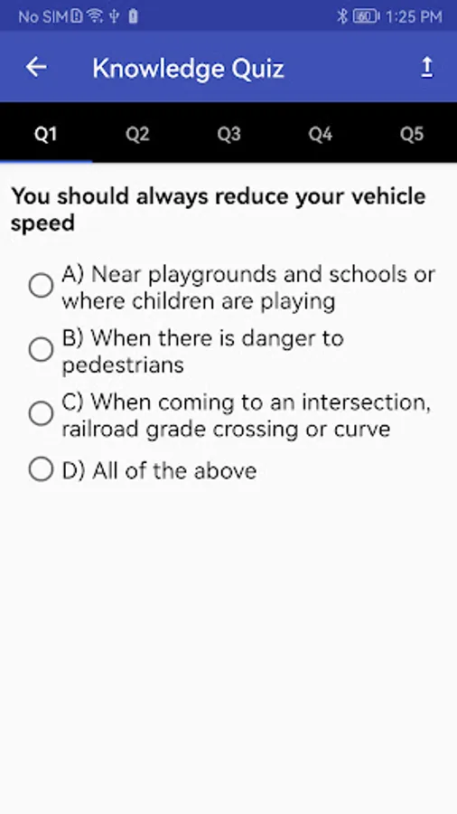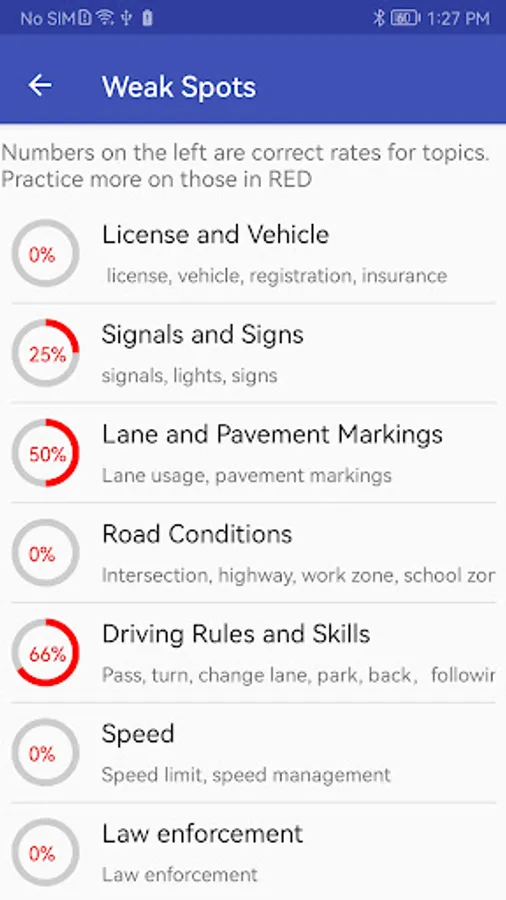 Knowledge questions are assigned to sections and topics based on Driver's Manual. You can choose certain sections or topics to practice.