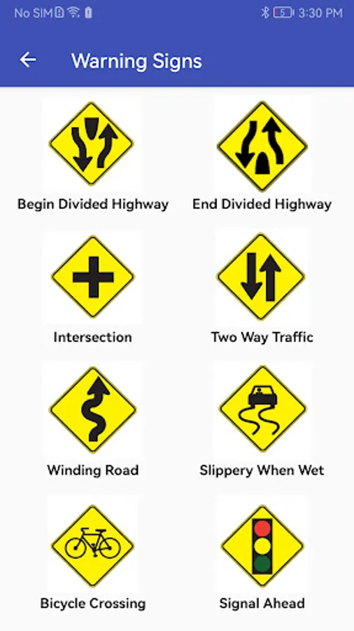 Road signs are assigned into different groups, e.g. warning signs, regulatory signs. And they can be shown in a list or flashcard mode. An easy way for you to learn these signs.