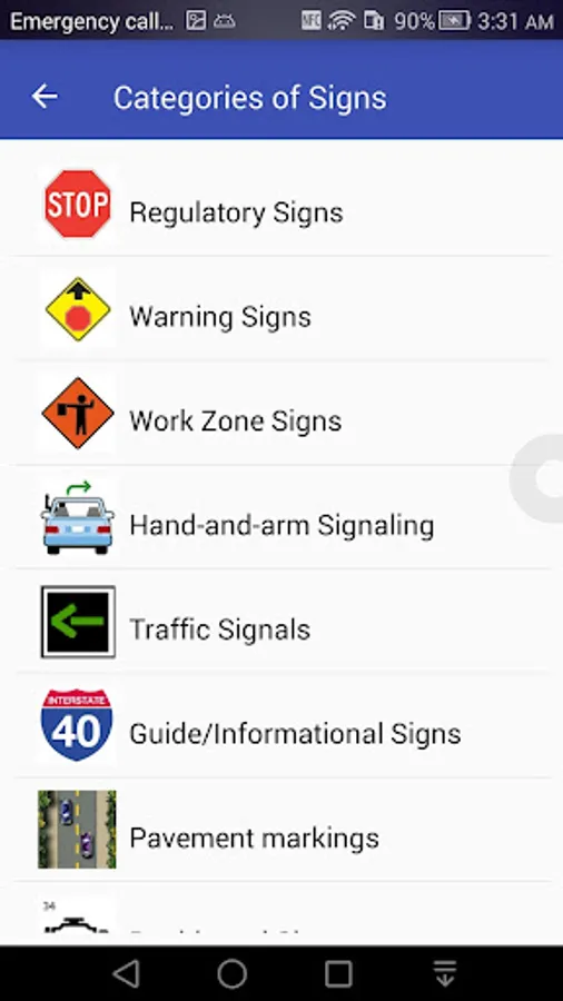 Traffic Signs are carefully organized into different groups, e.g. regulatory signs, traffic control signs and etc. All signs can be shown in list mode or flashcard mode. Makes it easy for people to remember these traffic signs.